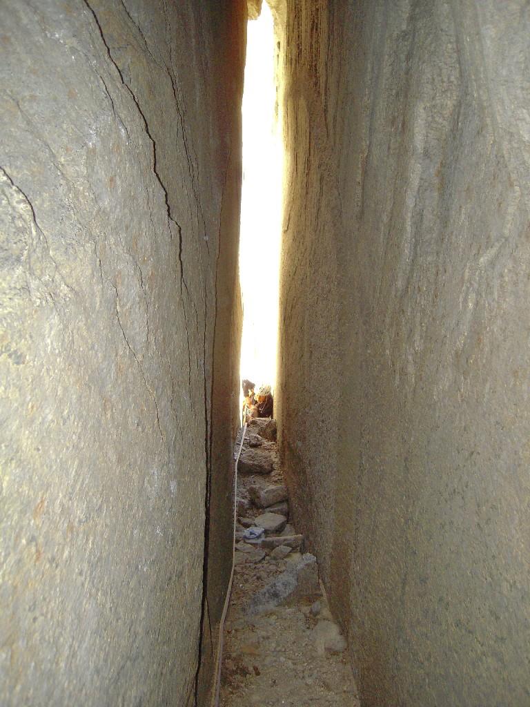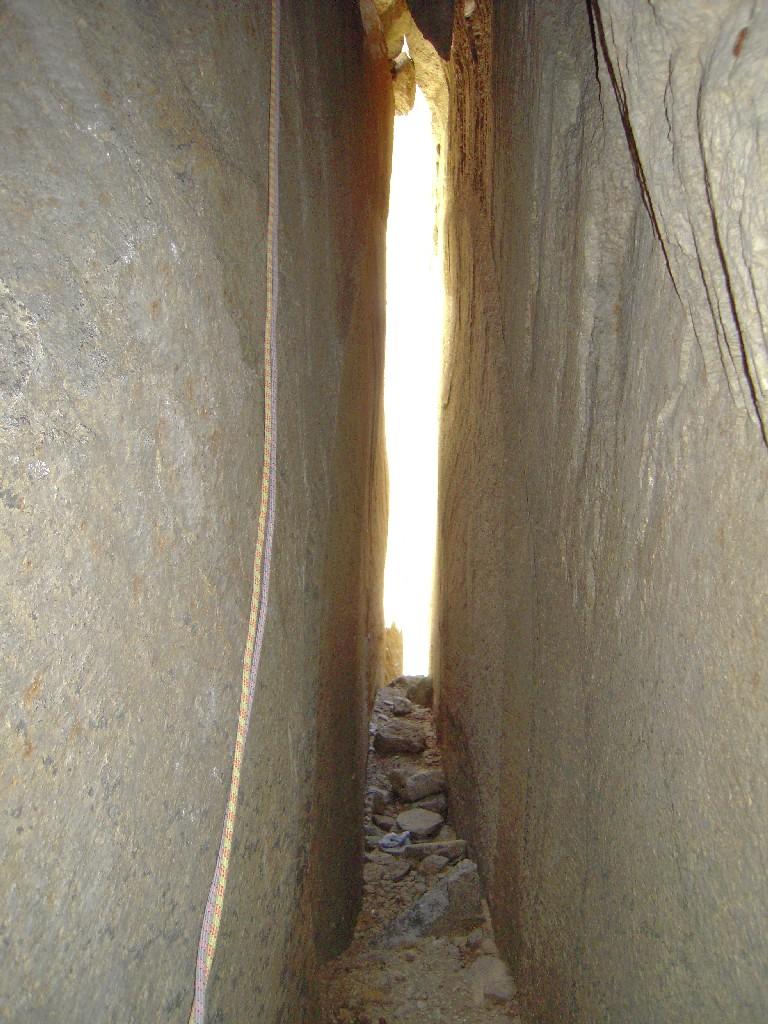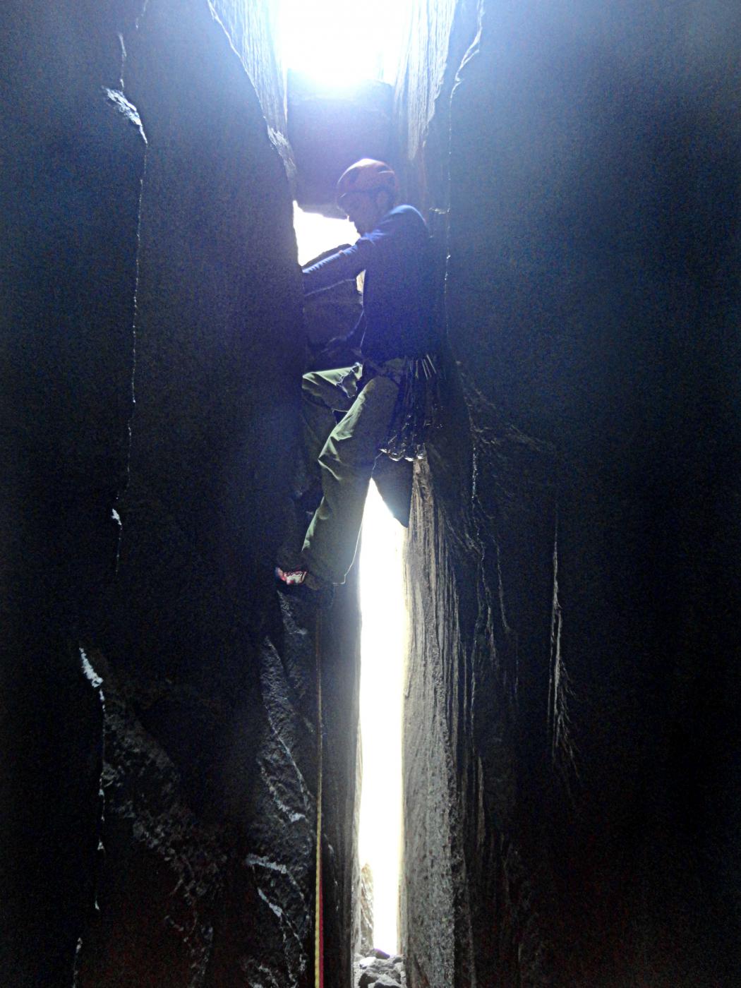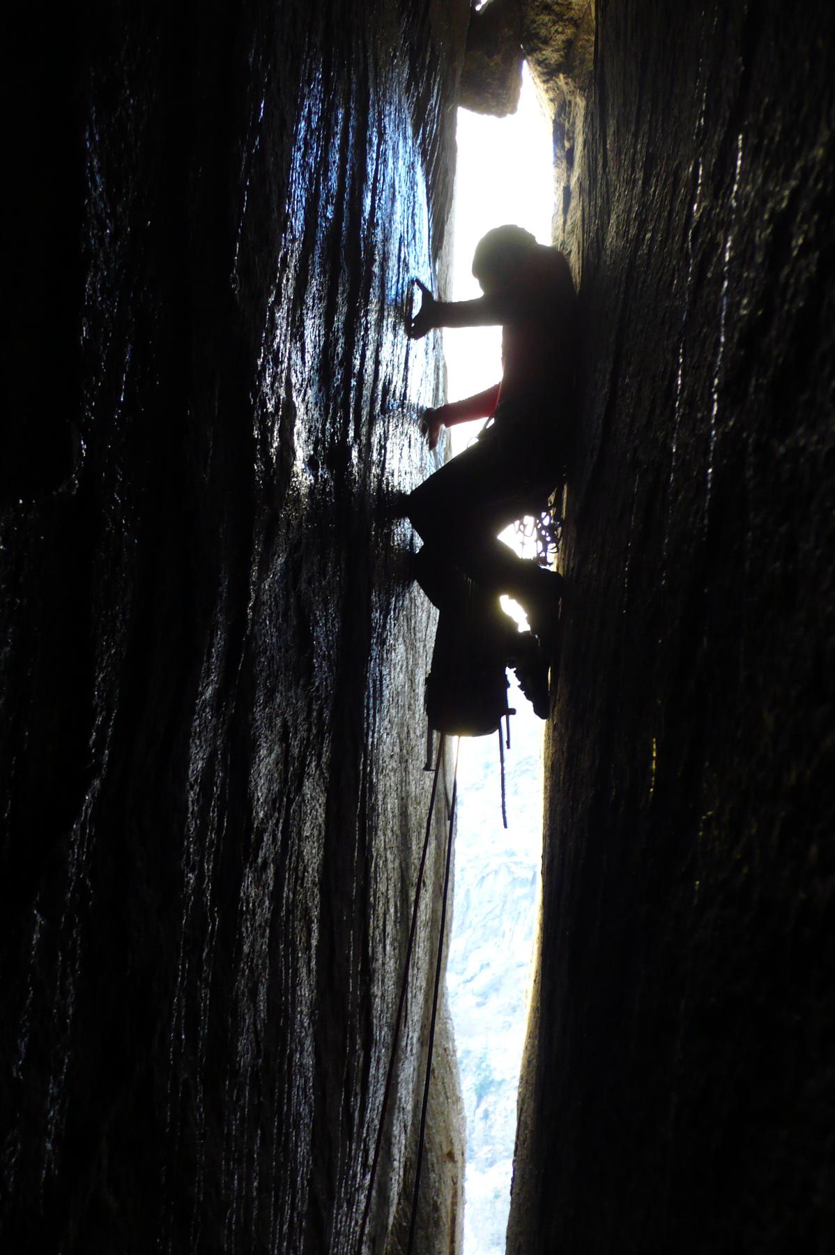 a) – Rinviarsi alla sosta e traversare a sinistra in placca (5a) sino a entrare nel camino. Camminare sul fondo sino a raggiungere alcuni massi incastrati dove si sosta.