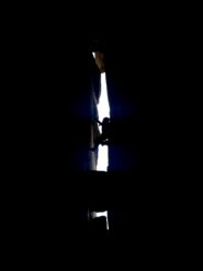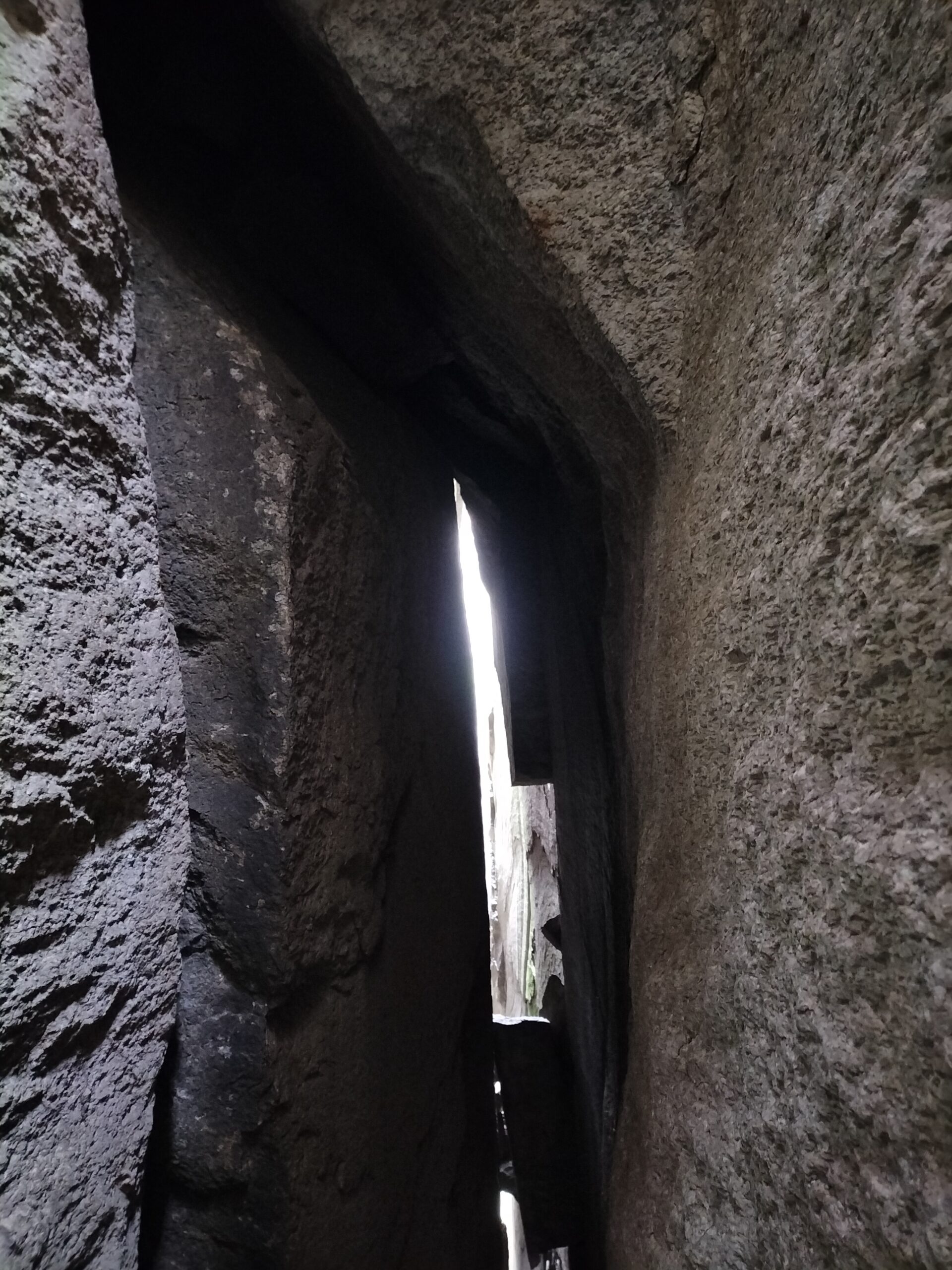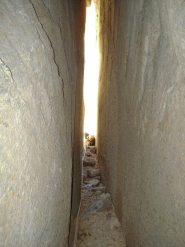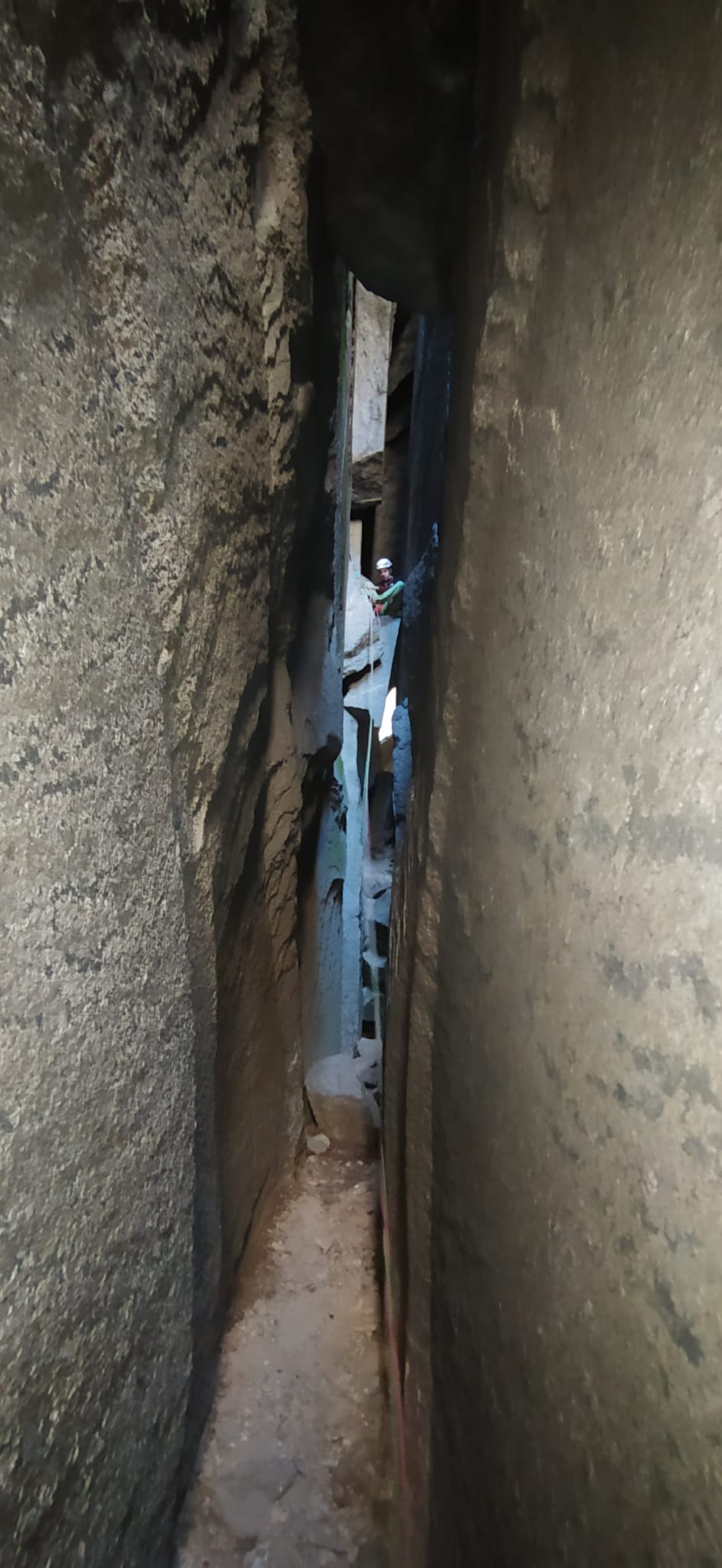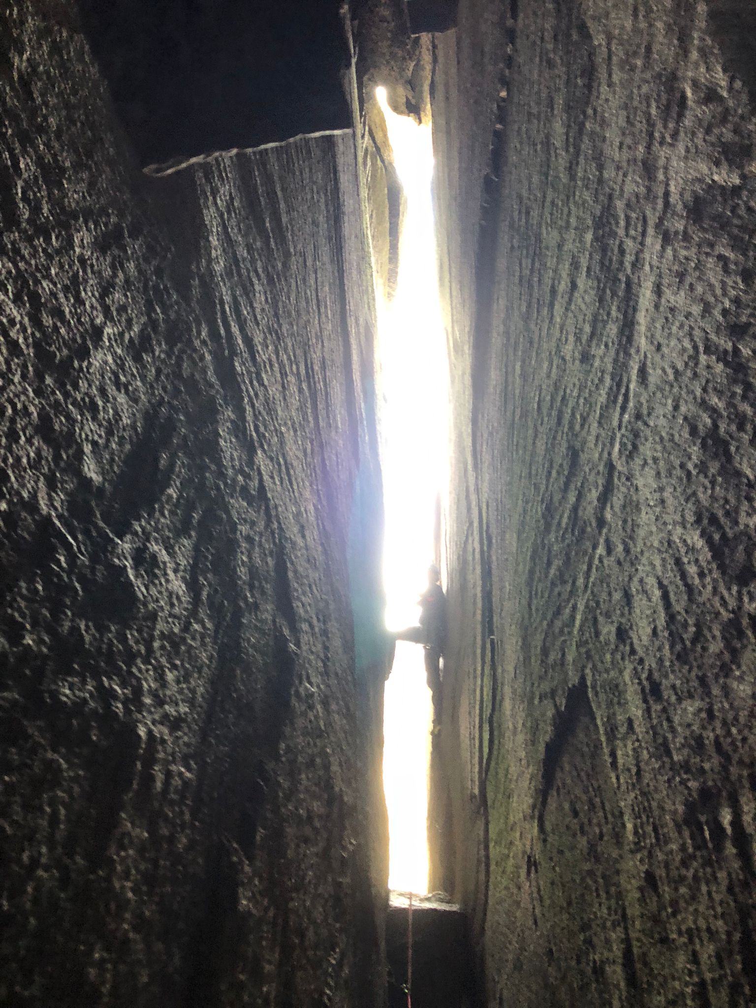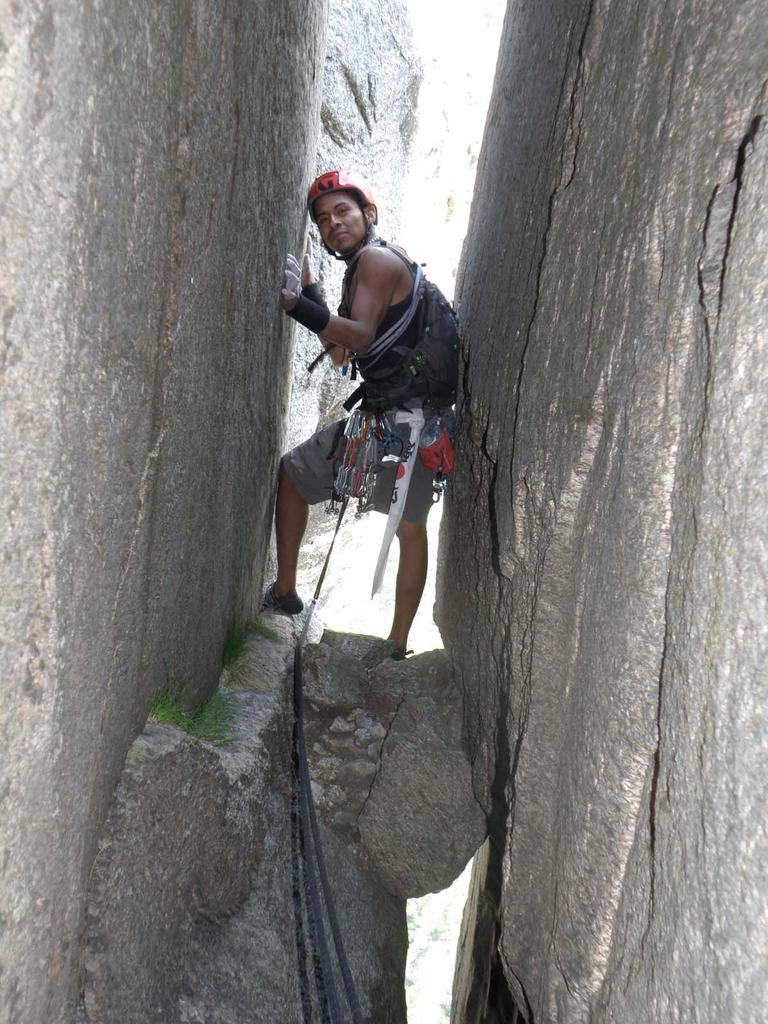 a) – Rinviarsi alla sosta e traversare a sinistra in placca (5a) sino a entrare nel camino. Camminare sul fondo sino a raggiungere alcuni massi incastrati dove si sosta.
