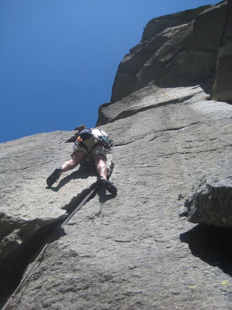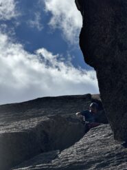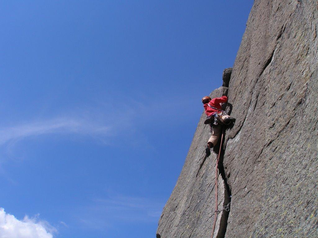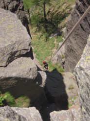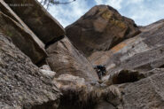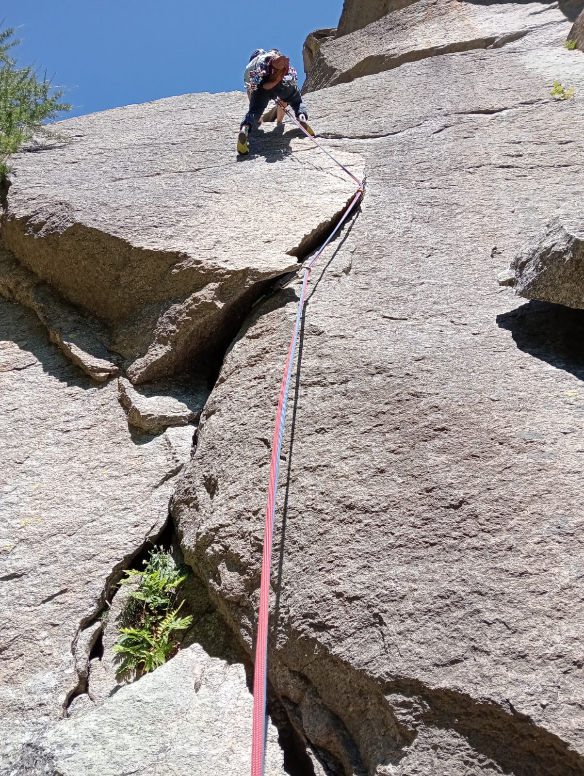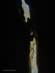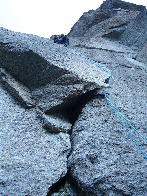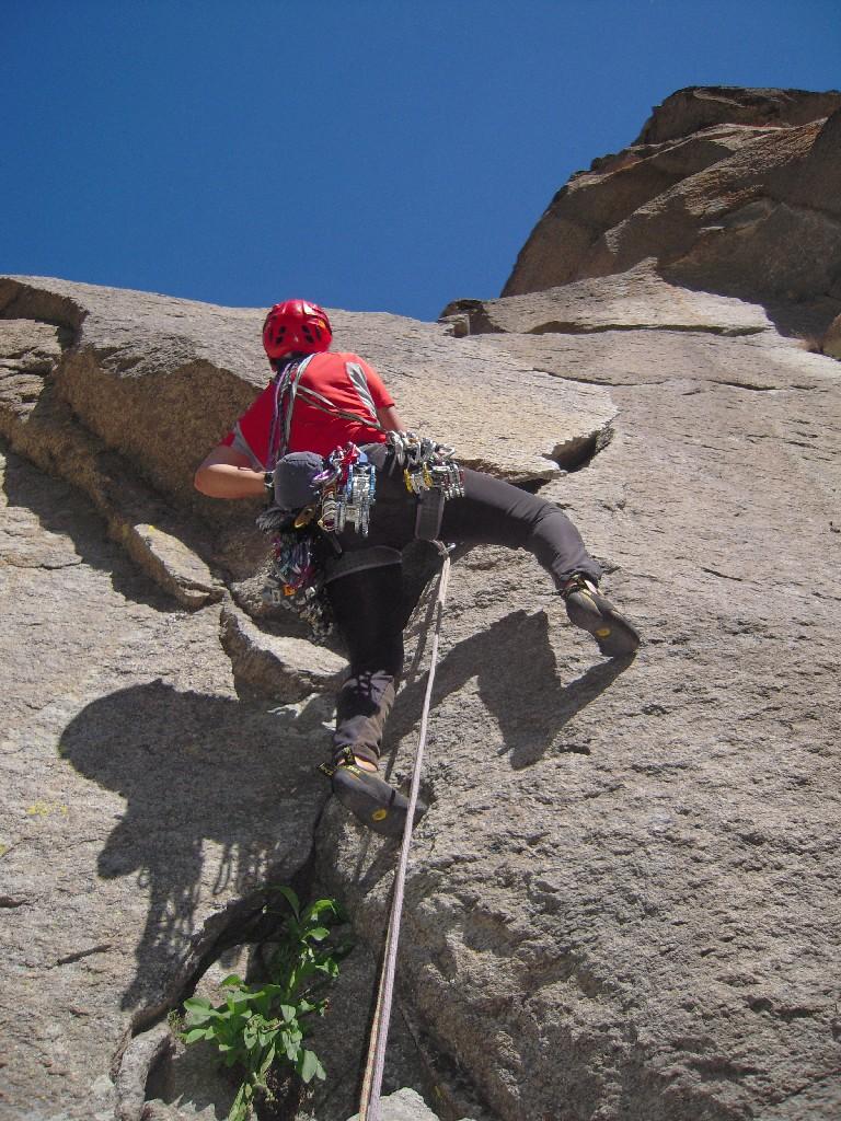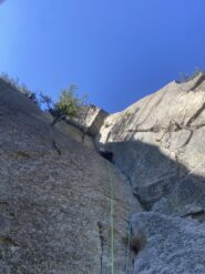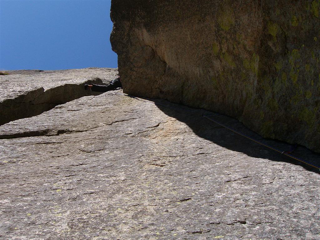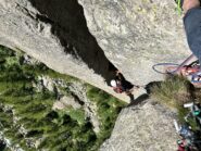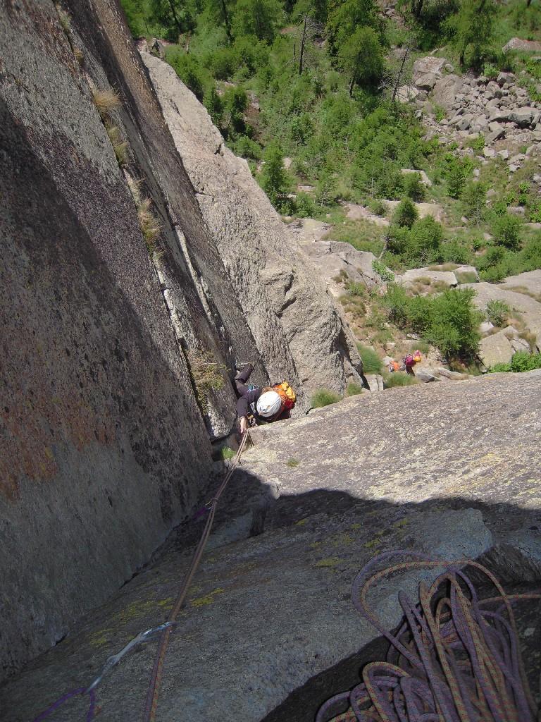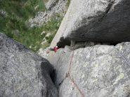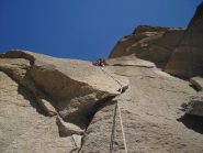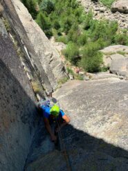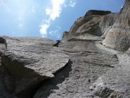 - L2: per balze e saltini raggiungere la base di un evidente diedro sulla destra. Il diedro è verticale, molto bello e ben appigliato (4c) essendo solcato da due nette fessure e ben proteggibile (friends 2/2,5) sino a che si esce ad una placca dove si trova la sosta a spit.