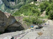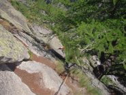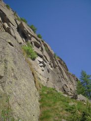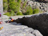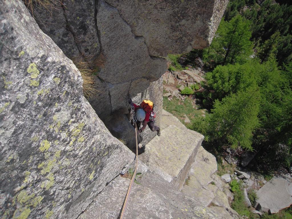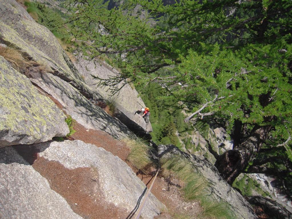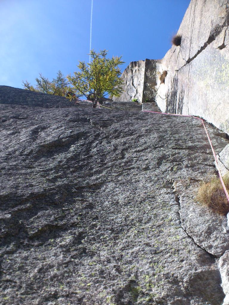 - L4: procedere a destra per facili lame sino a superare (4c) una fessura verticale (friends 2/3/3,5) che adduce alla cengia. Sosta su alberi. Questo tiro è facilmente concatenabile con il precedente.