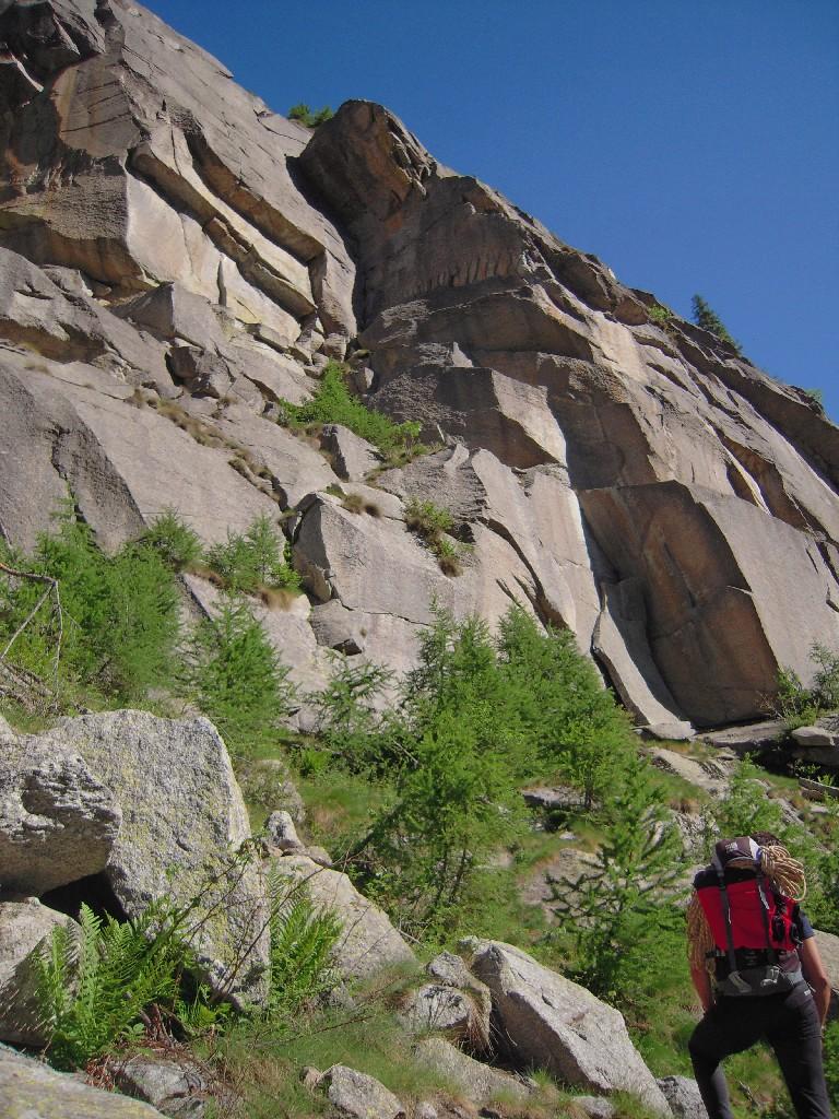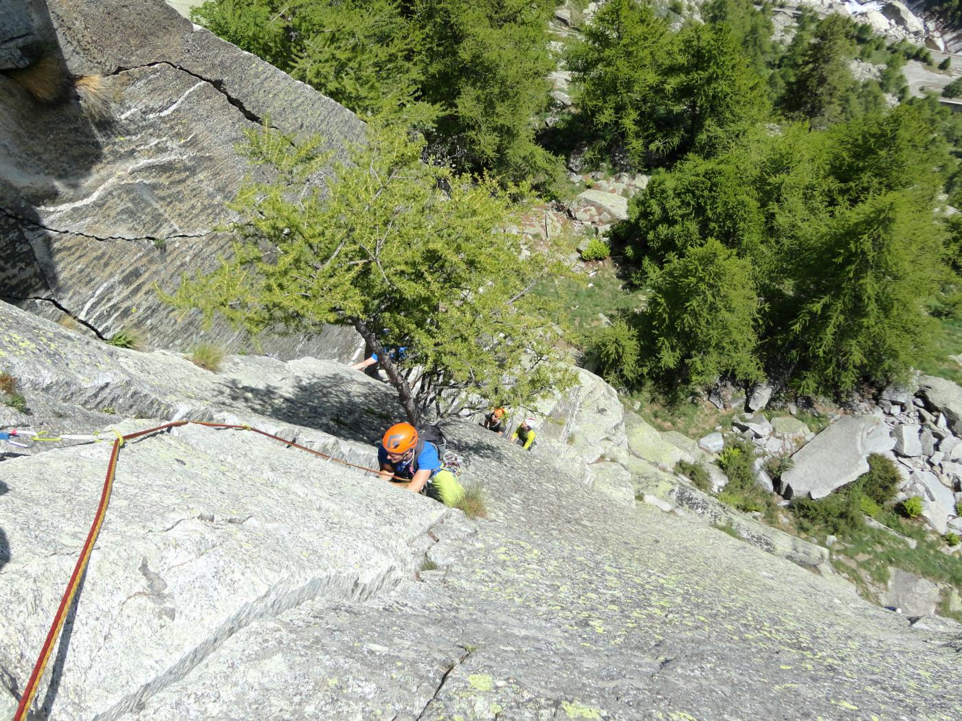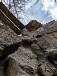 - L7: Superare lo strapiombo non facile uscendo in placca (5a). Proseguire per terreno più facile verso sinistra ad una radice e puntare verso gli evidenti alberi sulla sinistra.