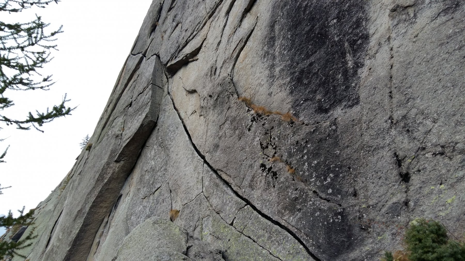 - L6: Attaccare il diedro, che presenta i primi metri facili dopo segue una sezione verticale dove il diedro è solcato da una fessura da dita sul fondo. Il passaggio è bello duro (6a) (possibilità di usare qualche nut o friends o meglio un buon chiodo a V). Salire sfruttando la fessurina per 4/5 metri (friends incastrati A0) raggiungendo una zona più facile. Traversare a sinistra in direzione dell’evidente albero. Affrontare la bella fessura verticale più dura all’inizio (5c) sino ad uscire a sinistra per lame superando un’ultima fessura. Sosta su spit.