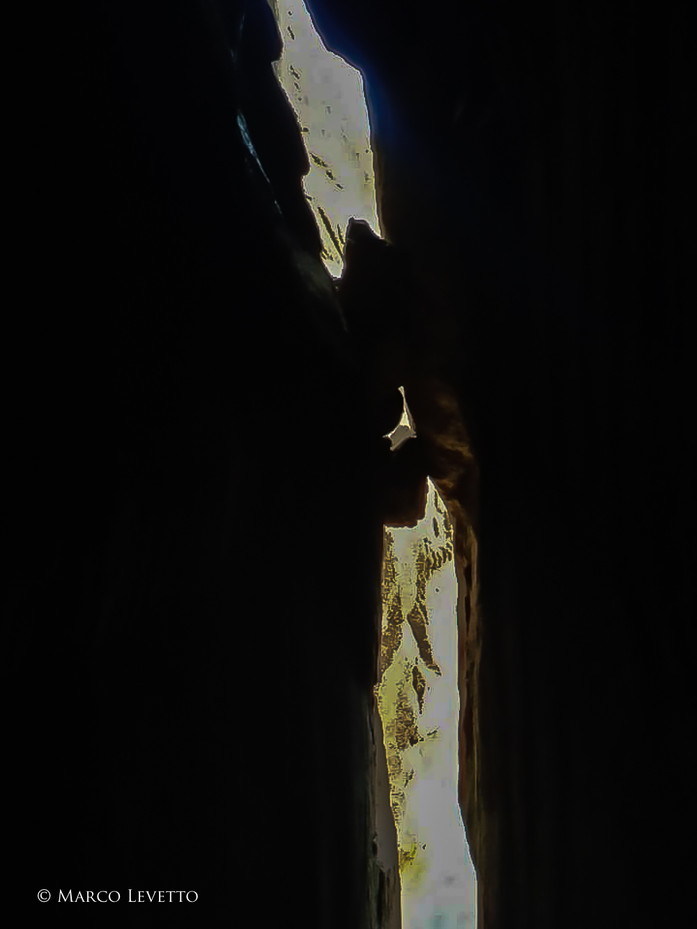 - L1: attaccare sotto la netta fessura ad arco. Salire per buone prese sino a prendere la fessura, seguirla prima a destra poi verticalmente (5b – friends 3,5/4) quando diventa più larga ci si incastra all’interno con la gamba destra e si raggiunge un comodo terrazzino. Superare una nuova fessura verticale ma appigliata (friends 2,5/3) e raggiungere il terrazzo soprastante. Sosta su spit.