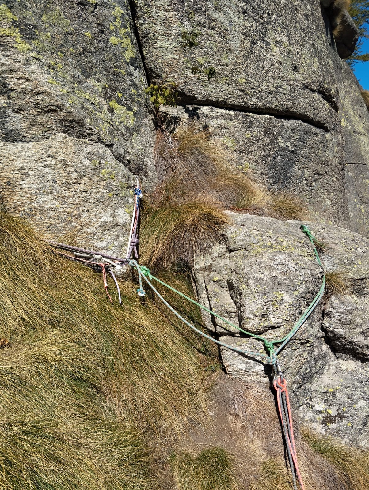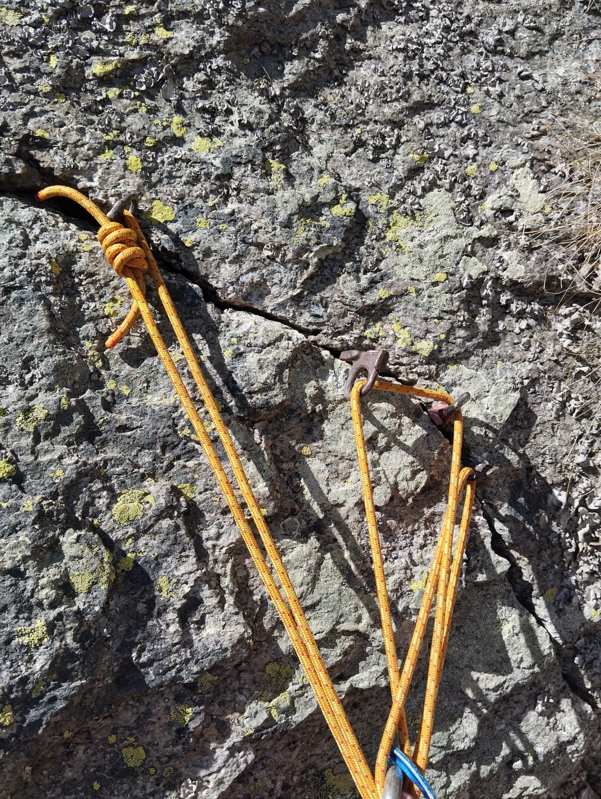 Prima via per me completamente trad, con me un tutor d’eccezione: Mirco, a me i tiri più semplici a lui quelli più impegnativi. I gradi della via generalmente rispetto alla relazione , personalmente li ho trovati un po’ stretti, 1/2…1 grado in più spesso ci sta, ma potrebbe essere un’impressione dovuta al fatto di sapere di non poter contare su protezioni fisse. Su L3 seguita variante diedro ad arco per me 6A con passo d’uscita 6A+. L6 trovata durissima, sicuramente più di 6A, impressione confermata anche dalla cordata successiva. Proseguito via sino alla fine ovvero con L7 ed L8. L7 partenza di 6A poi 5B ed uscita che offre 2 fessure a scelta sx 6A, dx 5b. Trovato 1 solo chiodo su S7 purtroppo ballerino e non ribattibile, quindi più che rinforzata, creata sosta con ulteriori 3 chiodi uniti da cordone giallo offerti da Mirco, ulteriormente integrabile con un BD n⁰3 sulla dx,