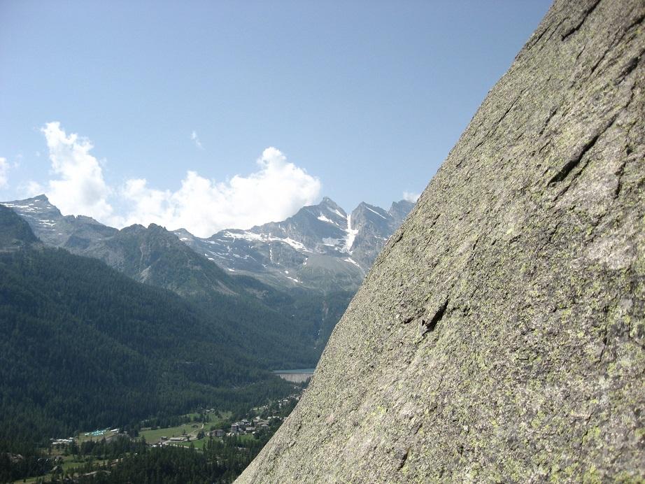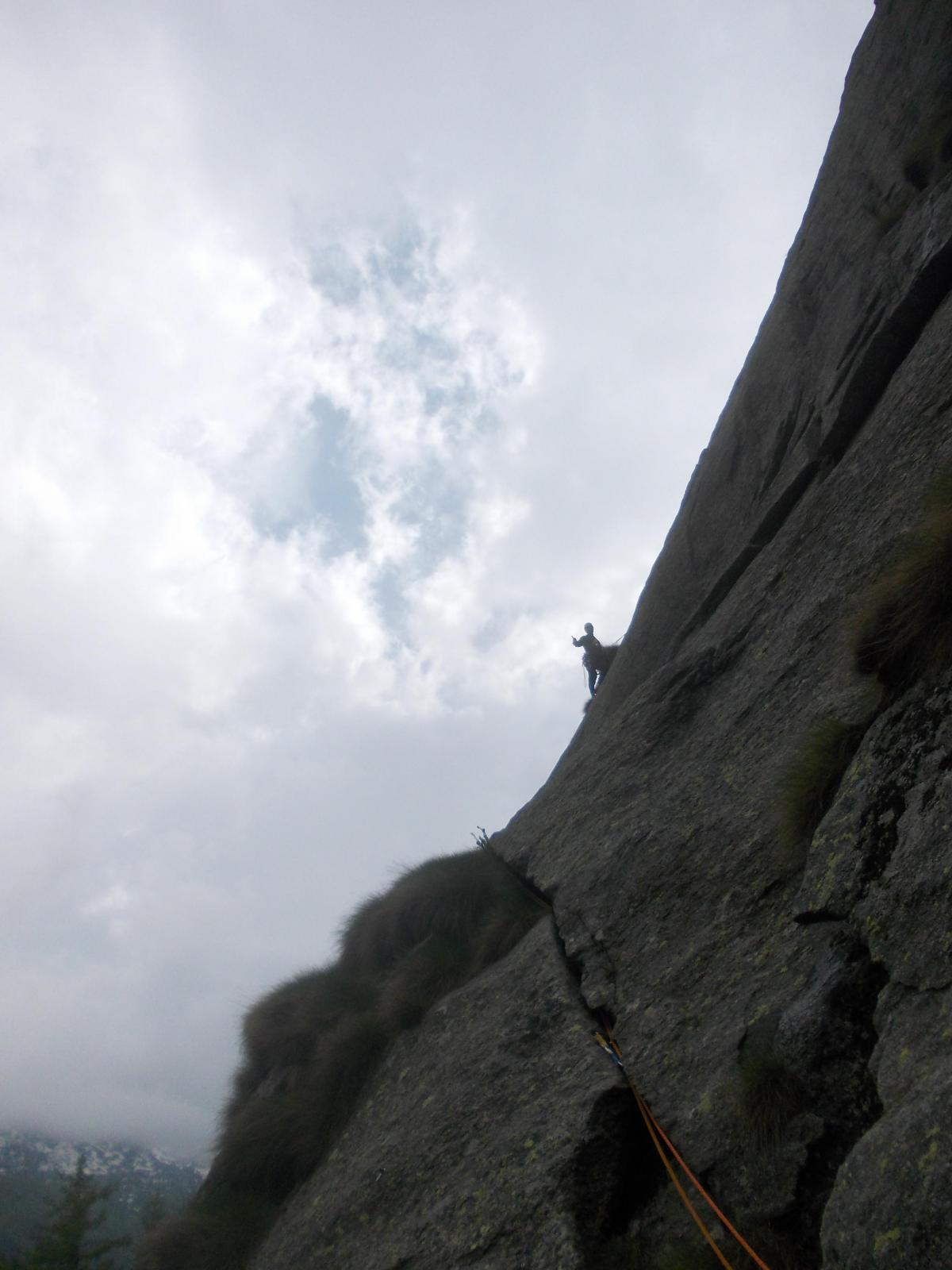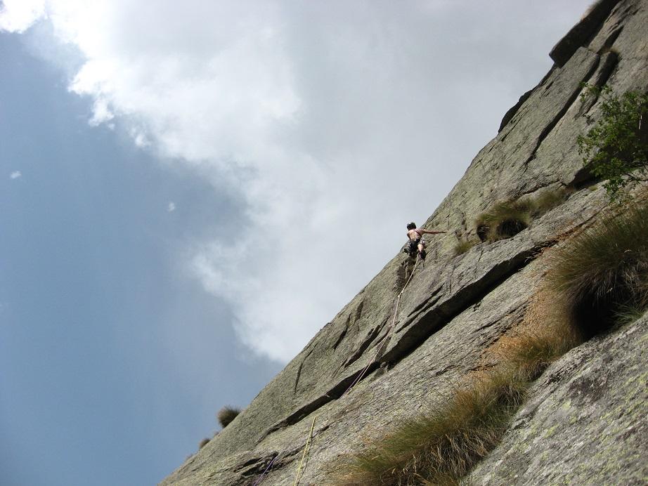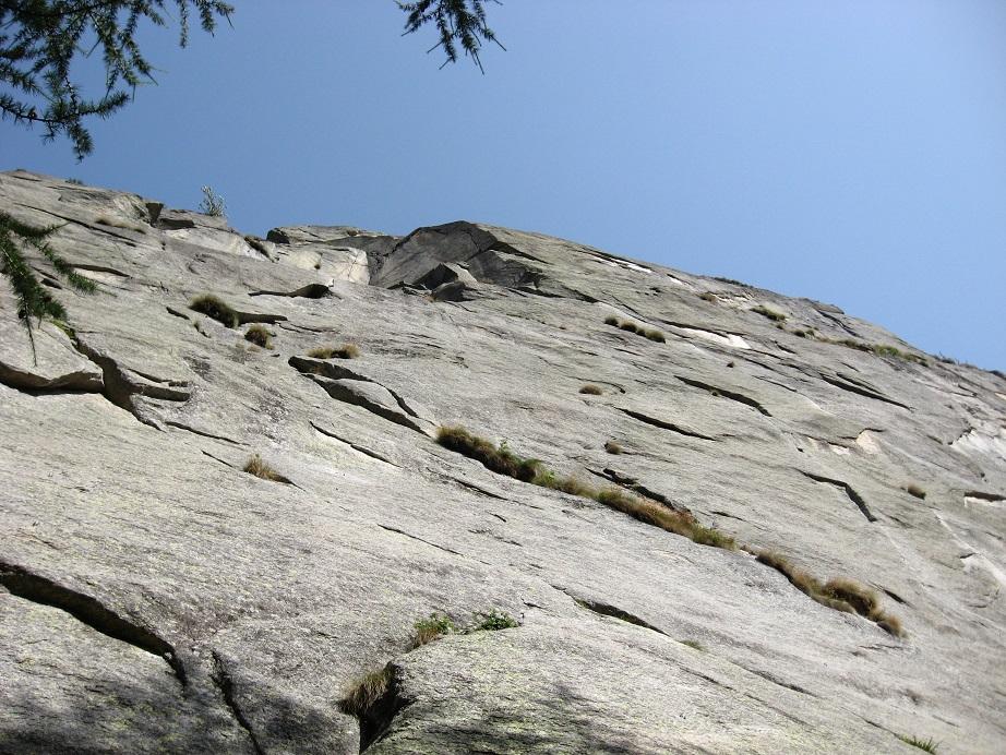 L7: salire su placca inizialmente verso destra per poi puntare ad un diedro con catena vecchia (tre punti), superare un muretto (passo di 6a, azzerabile), poi lungo runout inizialmente verso una rampa erbosa, poi raggiungere una delle due soste: se si va alla sosta di sinistra c’è un fix sulla placca più verticale, altrimenti traversare verso la sosta a destra, senza fix ma più facile. Possibilità di proteggersi all’inizio della rampa erbosa con #0.3 oppure #0.75 (4c)
