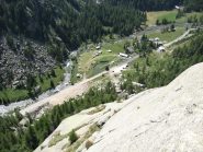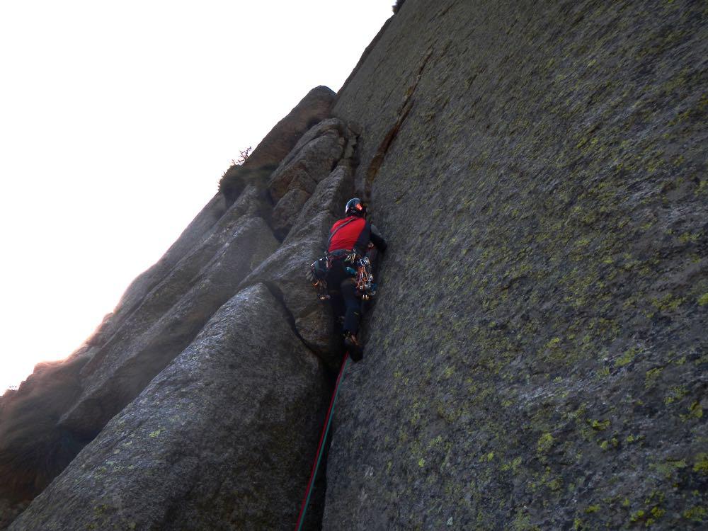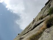 L6: salire su placca appoggiata costeggiando il diedro aperto sulla destra fino ad incontrare una larga fessura, che si segue per circa 20m verso destra (presente un unico fix, 4a)