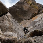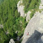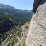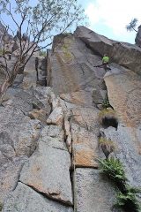 Salire una fessurina a sinistra della direttrice della fessura, spostarsi a destra con delicatezza su un grande blocco (friend piccolo in fessurina). Salire l’off width in dulfer e poi, quando la fessura comincia a strapiombare, ad incastro di mano. Uscita ancora difficile in ristabilimento. Possibile moulinette