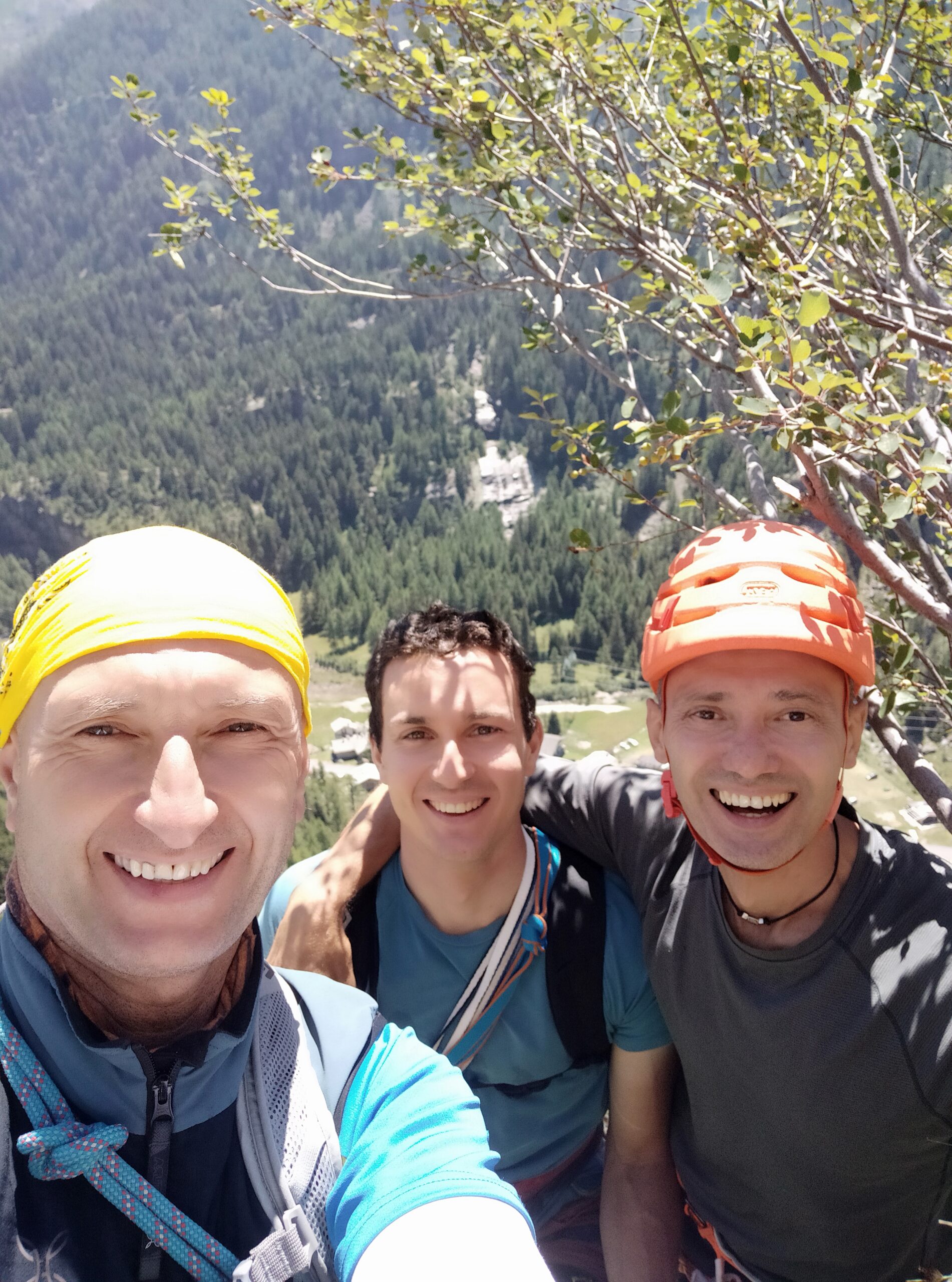 Via un po’ anonima nella parte bassa, si riscatta però nelle ultime tre lunghezze e diciamo che queste meritano il viaggio fatto, noi in alto abbiamo fatto la variante Lanza, oggi siamo partiti presto , per fortuna perché dopo poco si sono susseguite una decina di cordate, Friends inutili, giornata plasir ma soddisfacente per l’ottima compagnia. Con Chicco e Alberto