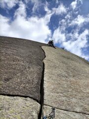 Via storica in cui i Primi tiri hanno un interesse prettamente Storico e alpinistico, i tiri più belli sono quelli in cima. Protezioni poco utili, ho messo solo un pezzo nel tiro prima della fessura dell’acqua. Portare giusto giusto un paio di pezzi medi. Chiodatura lunga che richiede Ottima confidenza sia nel grado che nella scalata su placca appoggiata di granito. Discesa su doppie abbastanza Scorrevoli.