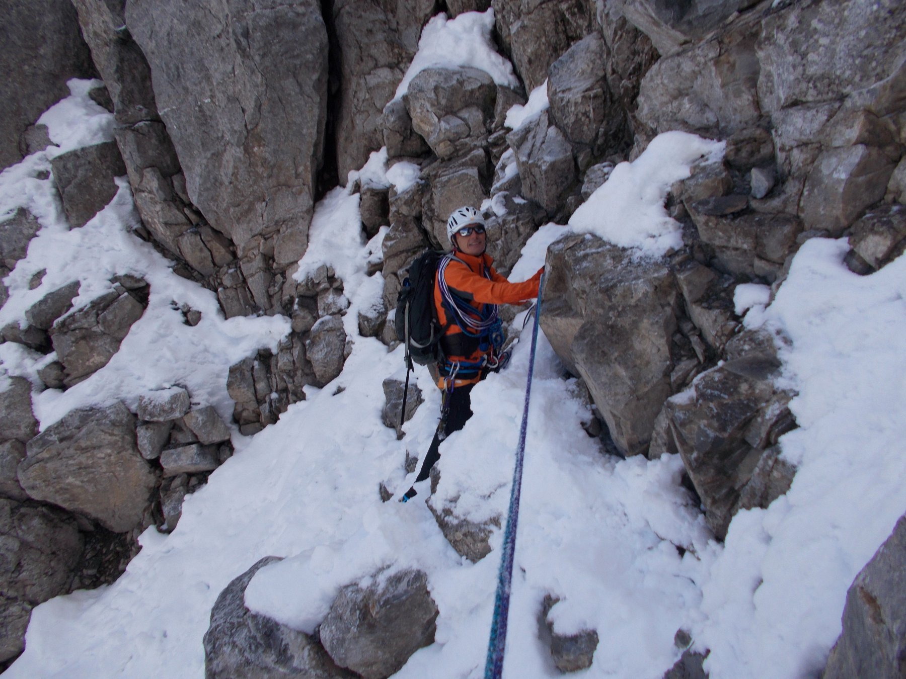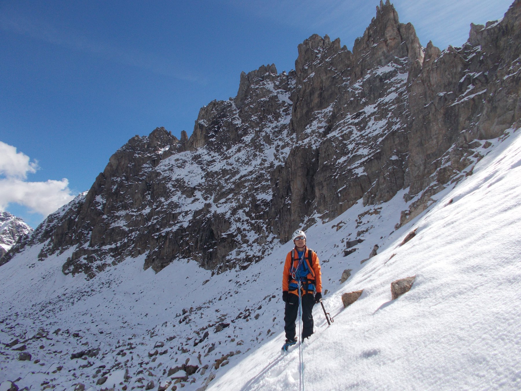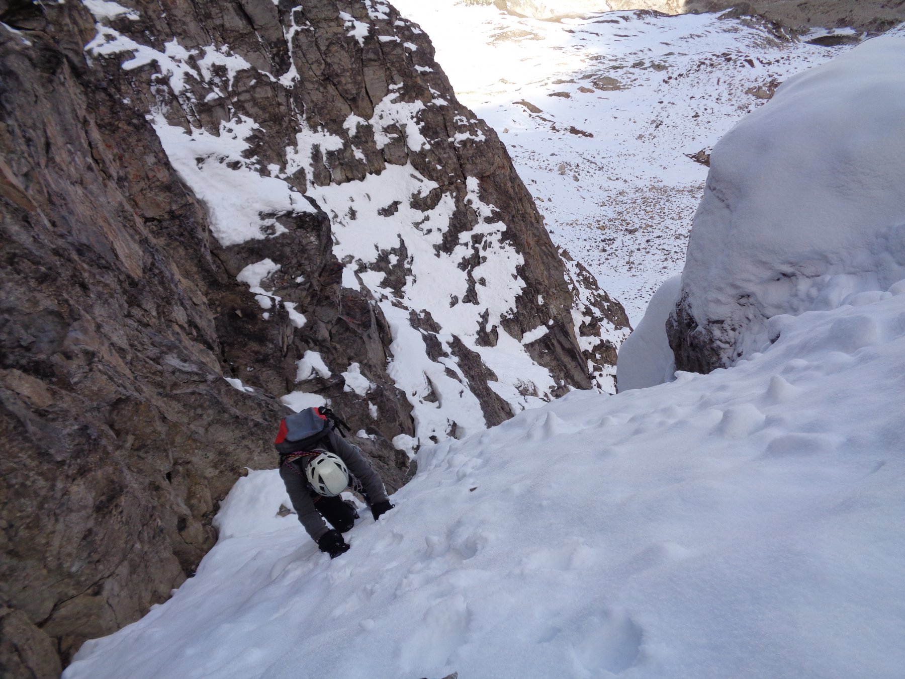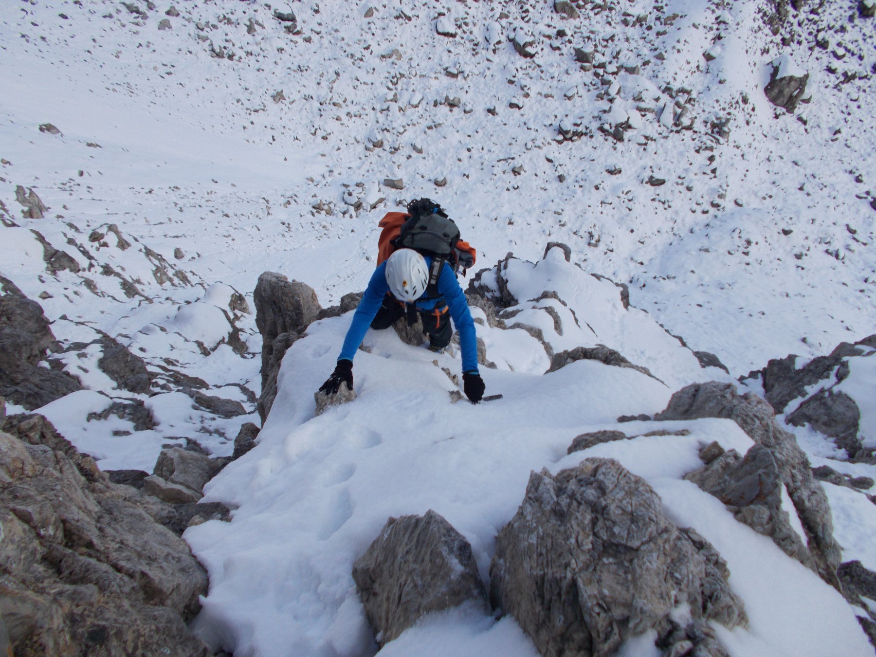 Reperire una cengia che con andamento ascendente da dx a sx immette in un canale . Il canale che presenta saltini brevi ma netti con rocce affioranti, termina a una forcella sul filo di cresta 2855 m circa. A dx la cresta prosegue affilata all’inizio più larga sul finale con passi presumibilmente di III° fino in vetta. (ore 2.30-3.00 per l’avvicinamento, dalle 2 alle 3 ore dall’attacco in vetta).