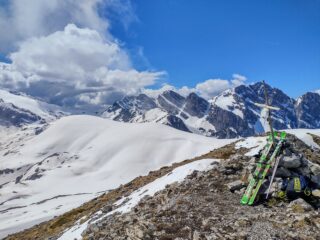 Oggi bel panorama,15 sciatori sul percorso.Innevamento sempre buono, qualche togli e metti sulla stradina. Parcheggio Auto al Pontetto. 15 Min sci a spalle