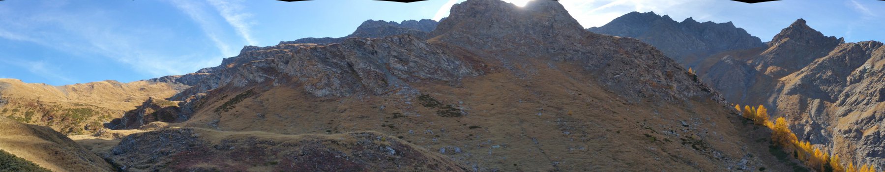 Si vedono sulla destra dei bolli rossi ed arancio, con un marcato sentiero che sale su una sorta di cresta erbosa, non vanno seguiti. Cercare invece sulla sinistra una traccia (due piccole linee rosse su un masso) che si alza ripida per sbucare su un vasto pianoro erboso. Lo si attraversa procedendo verso Sud ed aiutandosi con parecchi ometti e segni rossi, passando sotto una piccola paretina rocciosa che sostiene un prato superiore. Ci si innalza poi su un costone erboso verso destra fino ad una quota di circa 2730 m circa.
