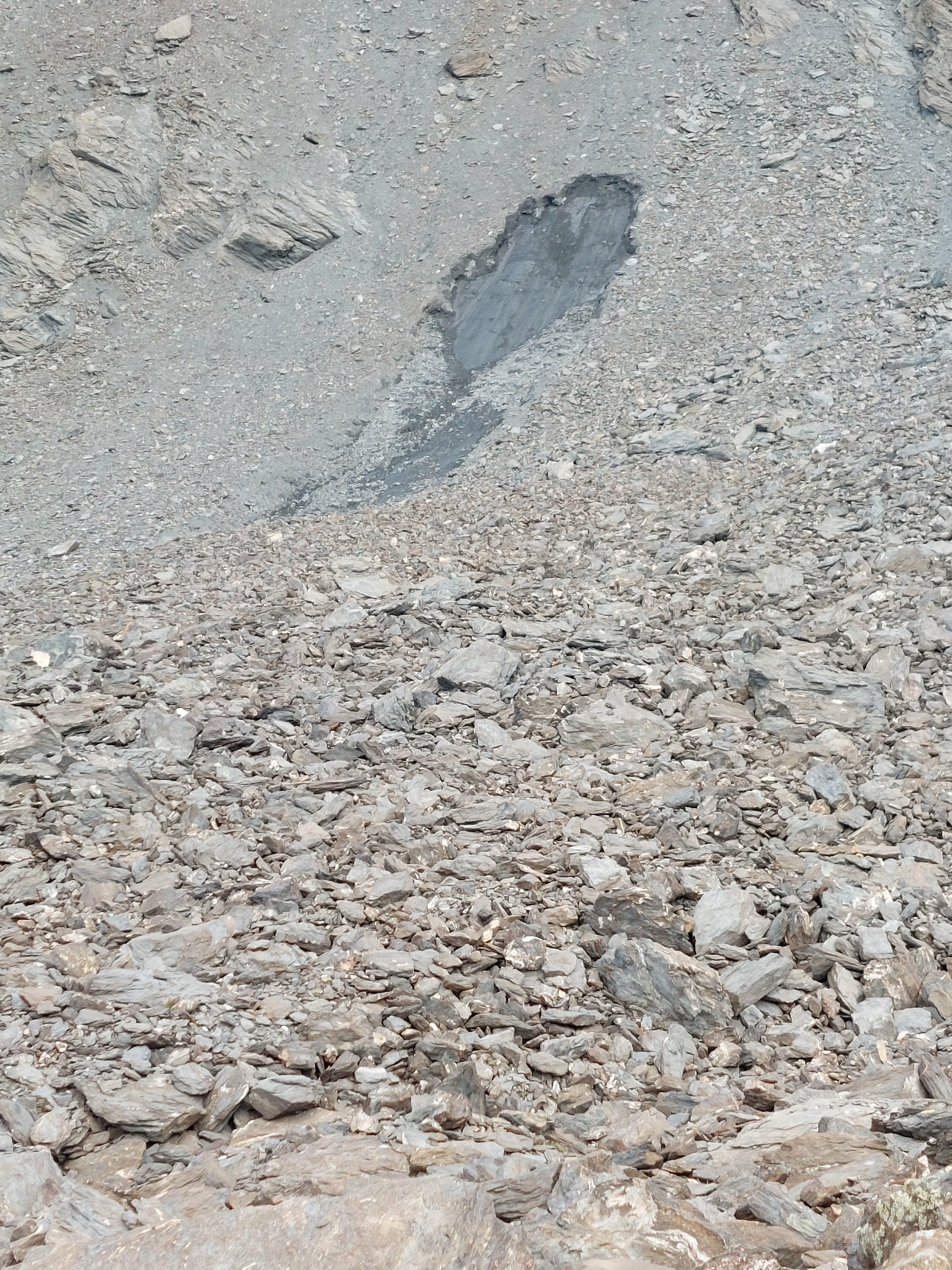Da questo punto, sempre seguendo i numerosi ometti ed i segni rossi anche essi frequenti ma un po’ sbiaditi, si inizia a percorrere, dapprima su terreno piuttosto ripido, poi con una lunga traversata verso destra e poi ancora su terreno ripido, una pietraia “infinita” che termina poco sotto il Colle del Pelvo.