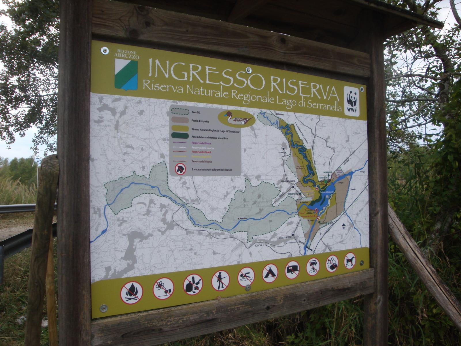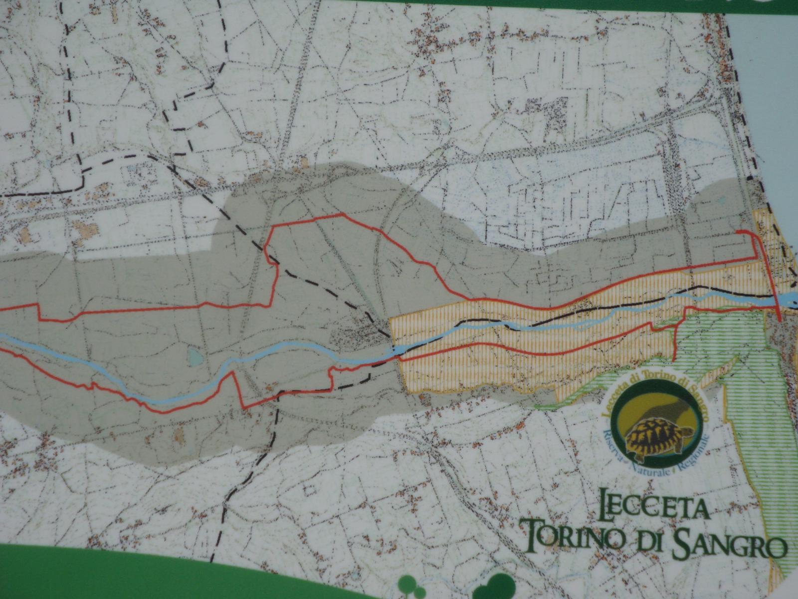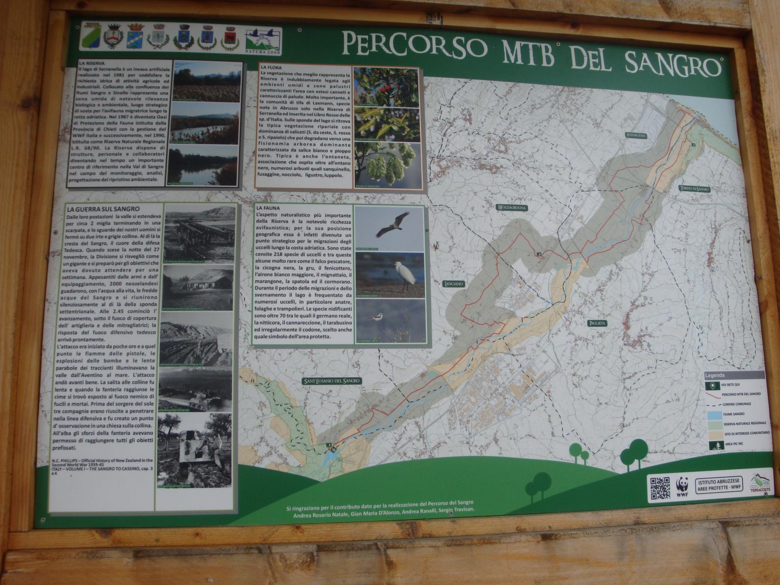 L’itinerario inizia dalla foce del fiume Sangro, nel territorio di Torino di Sangro.Percorre la sponda sinistra orografica del fiume Sangro,attraversando territori dei comuni di Fossacesia, Mozzagrogna, Paglieta, Lanciano, Sant’Eusanio del Sangro e Casoli, e raggiunge infine l’Oasi WWF “Lago di Serranella” (il centro visite), per poi tornare verso il mare lungo la sponda destra orografica del fiume ed arrivare nella Riserva Naturale “Lecceta di Torino di Sangro” (centro visite). Il punto più alto è a 121 mt slm in località Casale Romagnoli, a Lanciano.