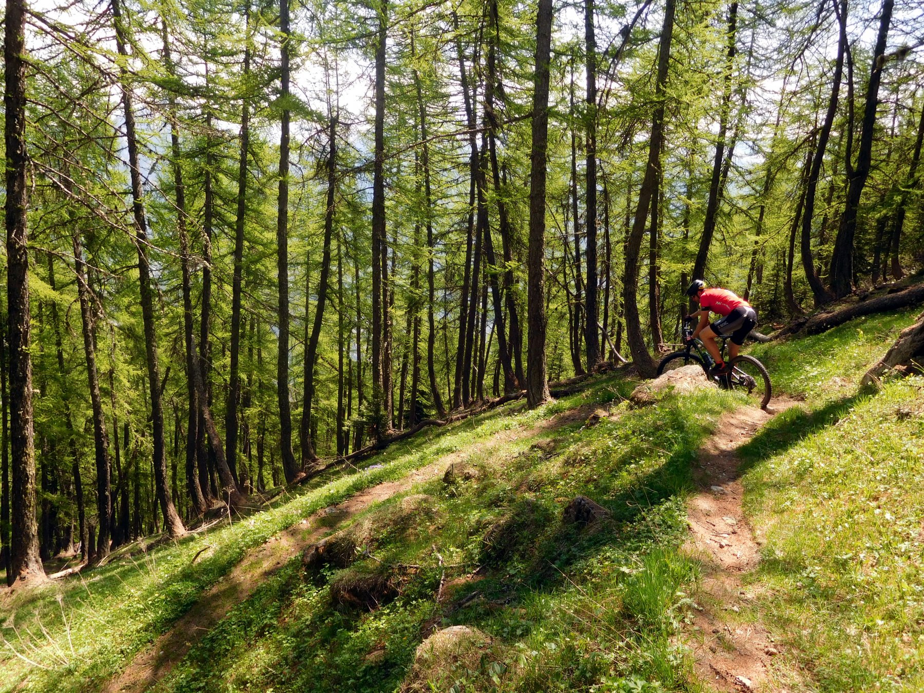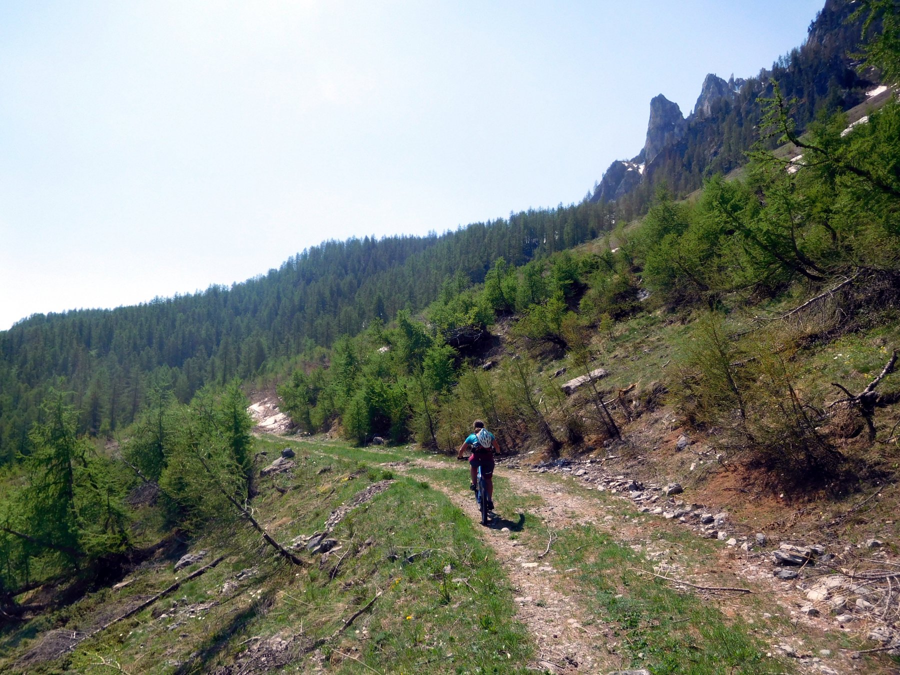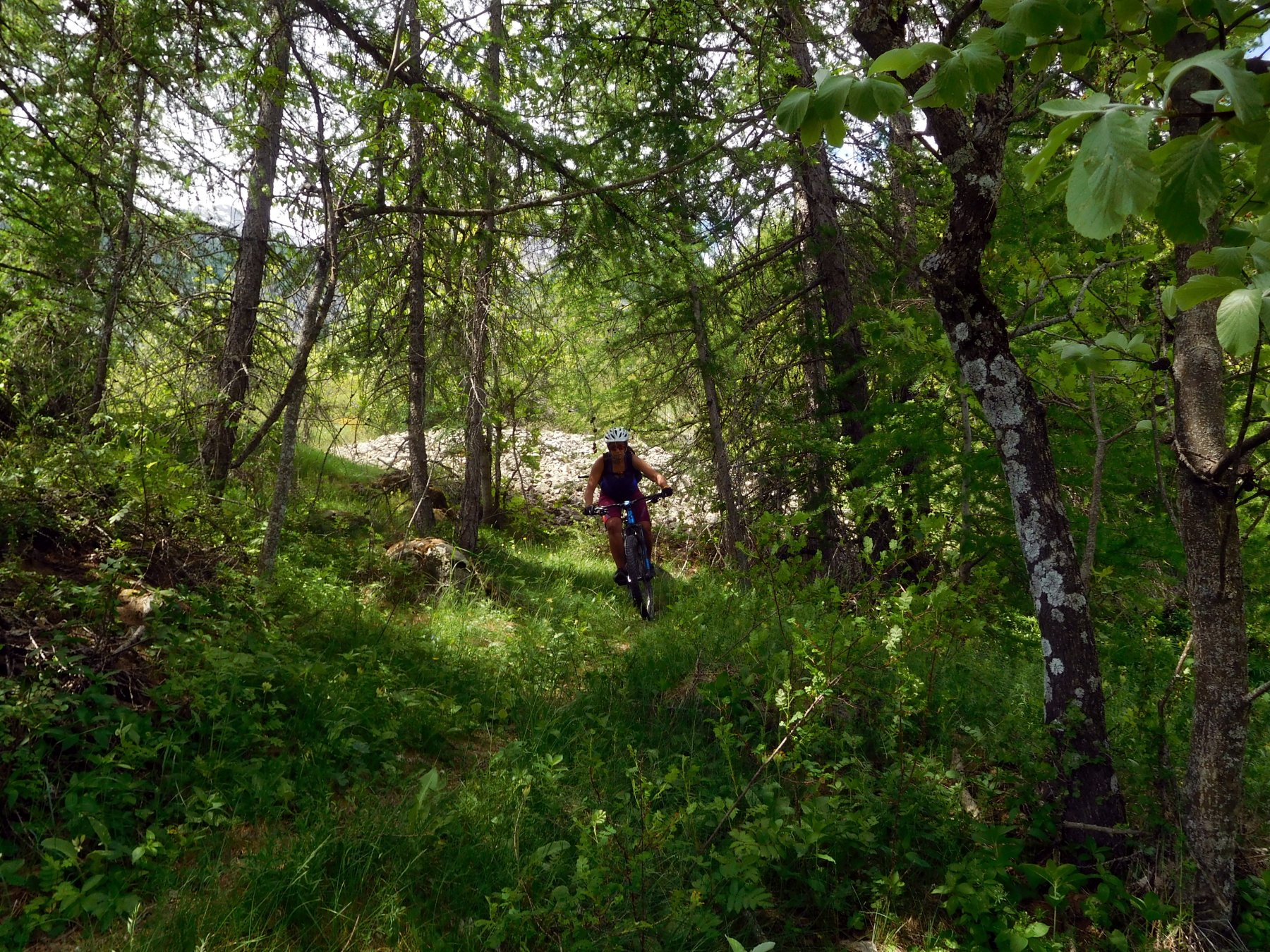 La traccia termina nel fitto del bosco ma una serie di balise bianco rosse (Grande traversée des Hautes-Alpes) aiutano a seguire il percorso corretto che qui va affrontato bici al fianco. In breve si raggiunge un sentiero nel fitto e splendido bosco che scende dal Col de Tramouillon dove ha inizio la discesa.