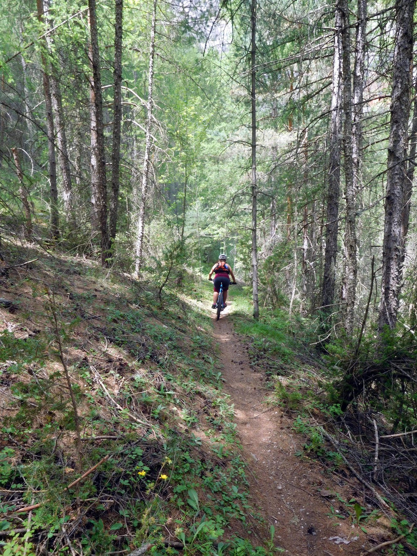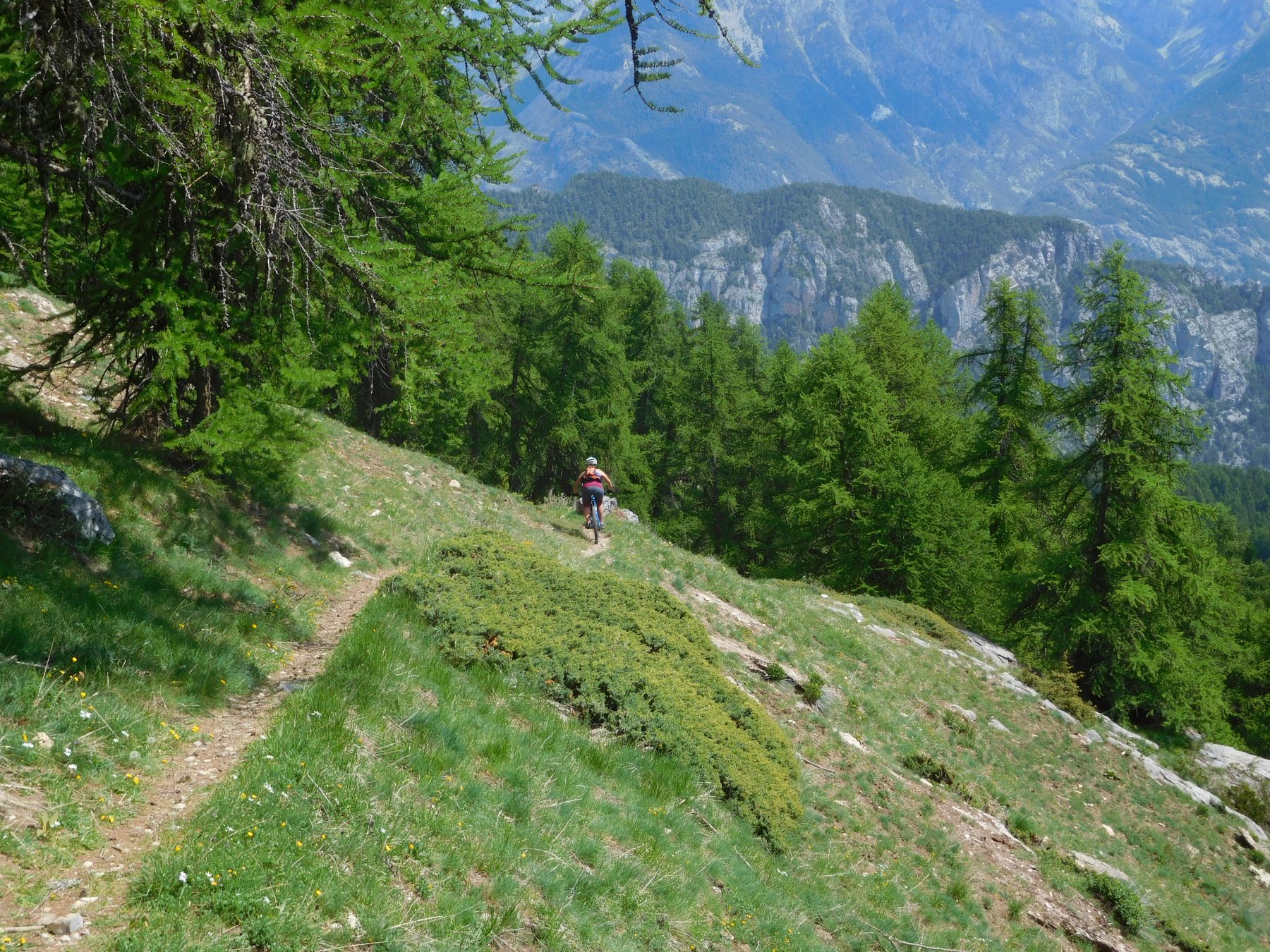 Da qui si deve tenere la sterrata che scende ed al primo largo tornante imboccare la mulattiera ben segnalata sulla sinistra (Les Rousses m 1225). Il percorso scende fino a raggiungere la plaine des Allouviers. Il percorso – pur sostanzialmente pianeggiante – rimane molto scorrevole su sentiero a dir poco perfetto, quindi raggiunge una sterrata che riporta comodamente al ponte da dove si era attraversato il torrente Biaysse.