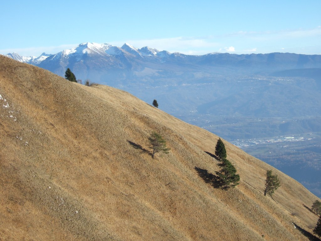 Dal passaggio a livello di Fiammoi, si segue per qualche decina di metri la strada asfaltata che porta a una casa, per poi deviare a sx e prendere una larga mulattiera che si innalza dapprima dolcemente lasciando ai lati varie tracce. Si segue sempre fino a trovare dei cartellini con la scritta “take off” (?) che puntano decisamente verso l’alto. Sempre nel bosco si continua a salire, si trova una baita (Sovilla) in legno, si traversa a sx e per buona, ma ripida mulattiera si continua a salire. Dopo circa 2 ore, si trovano i primi segnali bianco/rossi (bontà loro) che indicano la via per la vetta del Monte Serva e la variante per le Buse dei Vedei e le Crode de For. In breve con un piccolo saliscendi si esce dal bosco nei pressi di una grande croce che viene illuminata di notte, punto di partenza dei parapendii. Proseguendo diritto, si arriva al parcheggio del Cargador, punto di partenza classico per la vetta del Serva. Oltre la croce, prosegue sui ripidi prati una traccia che un centinaio di metri sopra, incrocia un ulteriore sentiero che seguito a sx porta alla salita della via normale. Noi proseguiamo invece sulla dx per traccia non segnata , ma molto marcata sempre su prati molto ripidi (attenzione con neve, ma anche con l’erba secca). Questa prosegue portandosi sul versante sudest e unendosi alla traccia che sale dalla Busa dei Vedei e proseguendo per le Crode dei For. Senza più traccia saliamo direttamente per i ripidi prati verso la sommità del Col Cavallin, dove incrociato il sentiero per casera Pian dei Fioc, riscendiamo e con un breve anello ci portiamo sul sentiero di salita. Discesa fino a quota 500 metri per il sentiero fatto in andata. Poi discesa diretta per stradetta fino al centro di Fiammoi (più comodo). Per la strada asfaltata, in 10 minuti all’auto.