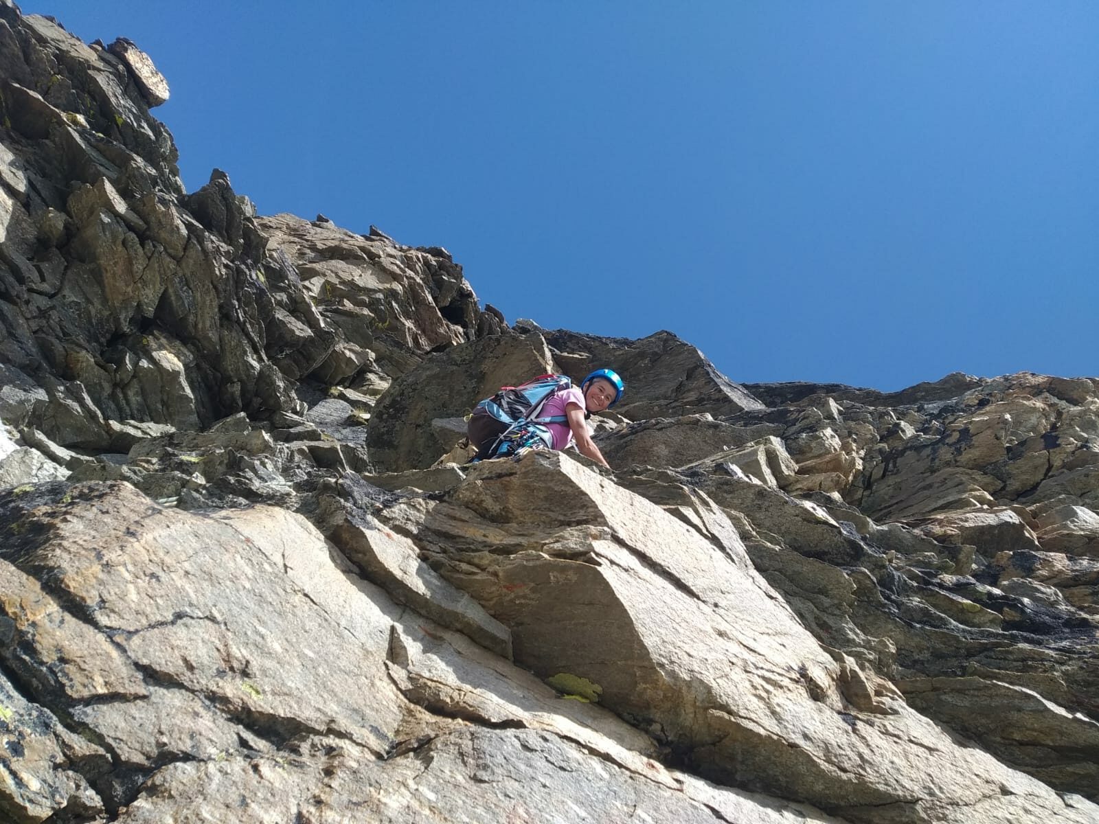 L6 – (3a) Muro fratturato, poi dritto per dei gradini. Sosta su cordone. (2 fix).