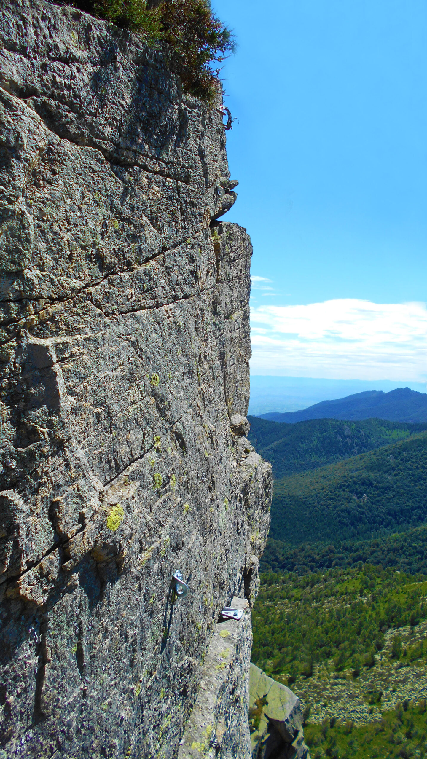 Necessari 10 rinvii e anelli di corda/fetucce con relativi moschettoni a ghiera per collegare gli spit disgiunti delle soste allestite per la sola progressione..