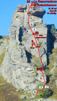 attaccare verticalmente in prossimità della targa (5a un passo), poi salire obliquamente verso dx per facili placche fino a rinviare il 2° spit(4°) e da lì procedere orizzontalmente(3°) portandosi sotto un bel pilastrino verticale, apparentemente poco ammanigliato, che farebbe pensare ad un grado più elevato di quanto in realtà non sia.. ed attaccarlo nel punto più basso possibile, in prossimità dello spigolo dx.