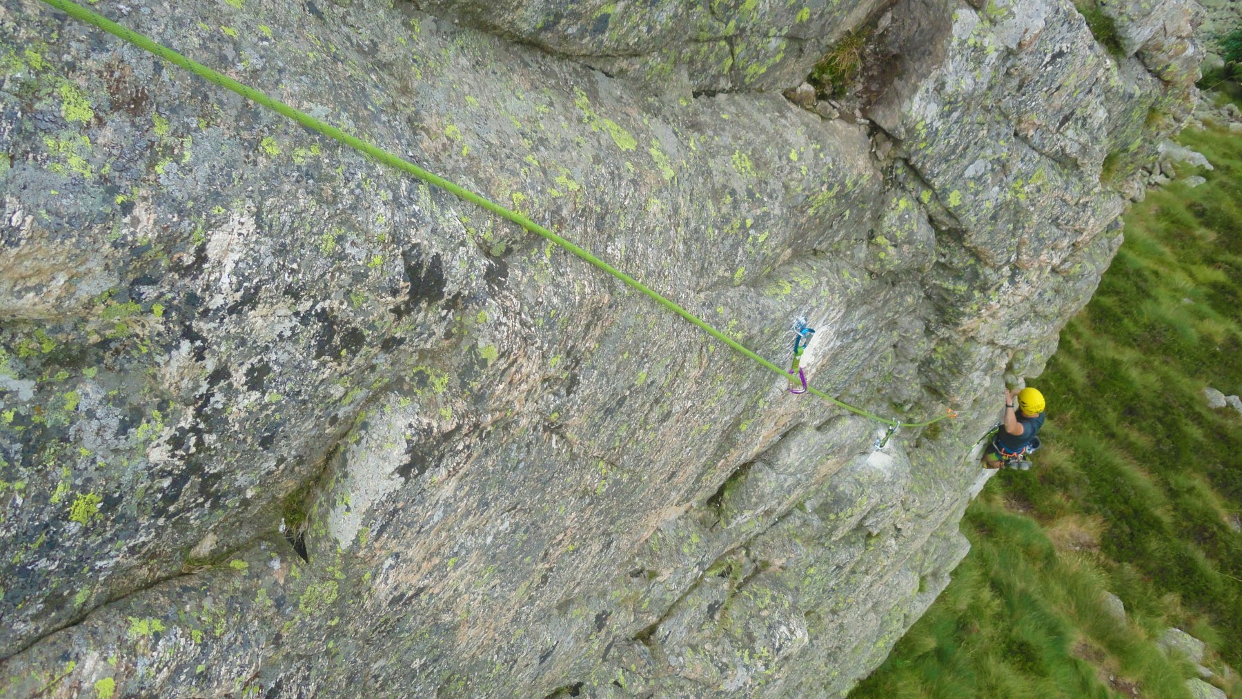 Sul muro finale di ottima roccia, compatto e perfettamente verticale, è stato possibile realizzare una spittatura più lunga, ma non per questo meno sicura, che ne rende obbligatorio il grado regalando sensazioni intense al primo di cordata..
