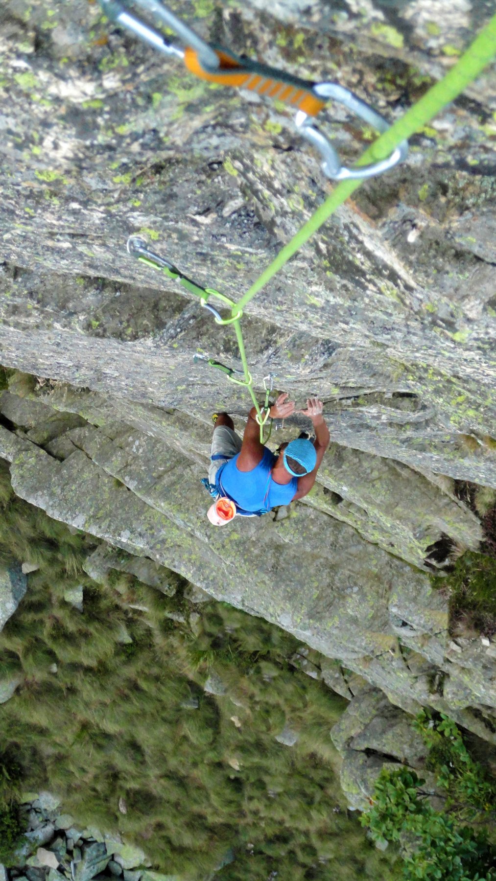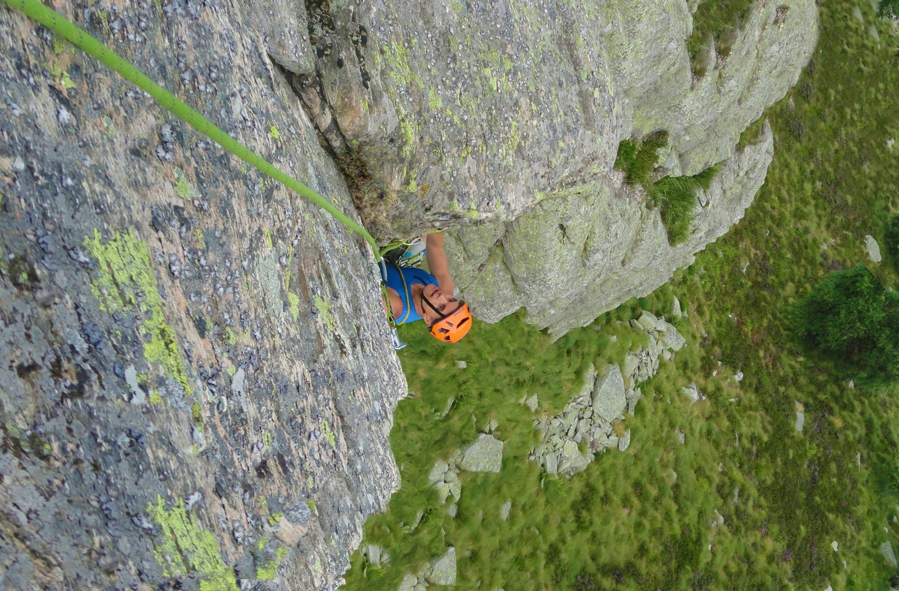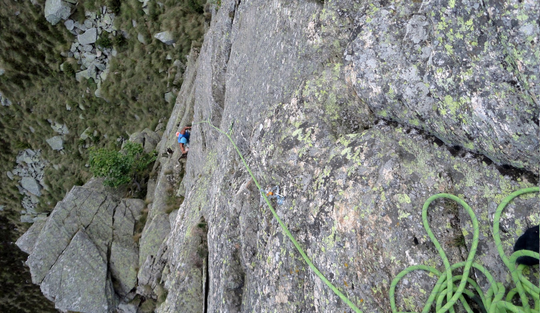 Il secondo tratto verticale, inizialmente di 5b, sale leggermente a sx poi verticalmente superando un diedrino esposto ed un successivo spigolo aereo con passi di 5c giungendo su un pulpito decisamente esposto dove è posizionata S2.