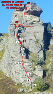 - L3 (20 mt., max 5a) : Da S2 comodissima (terrazzo roccioso che suddivide la parte bassa dalla parte alta della struttura), proseguire a dx (trasferimento) fin sotto il lato dx del grande diedro che sale la parte finale della struttura. Reperire la fila di spit che sale in prossimità dello spigolo dx del suddetto lato e mantendosi dapprima sul filo dello spigolo (5a) e poi sul muro quasi verticale caratterizzato da generose reglette orizzontali (5a), si giunge in sosta 3 dove termina la via.