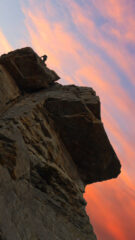 - con un passo si sale sulla sommità piatta della struttura, scendendo dapprima per facili placche sul lato opposto (prestando solo un po’ d’attenzione al lichene nel caso siano bagnate) e poi per ripidi sentieri a lato dello sperone stesso. Consigliato il sentiero sul versante sx (guardando a valle) poichè, anche se più ripido, è più scalinato e permette di raggiunge in minor tempo il punto dove attacca la via (10 min.);