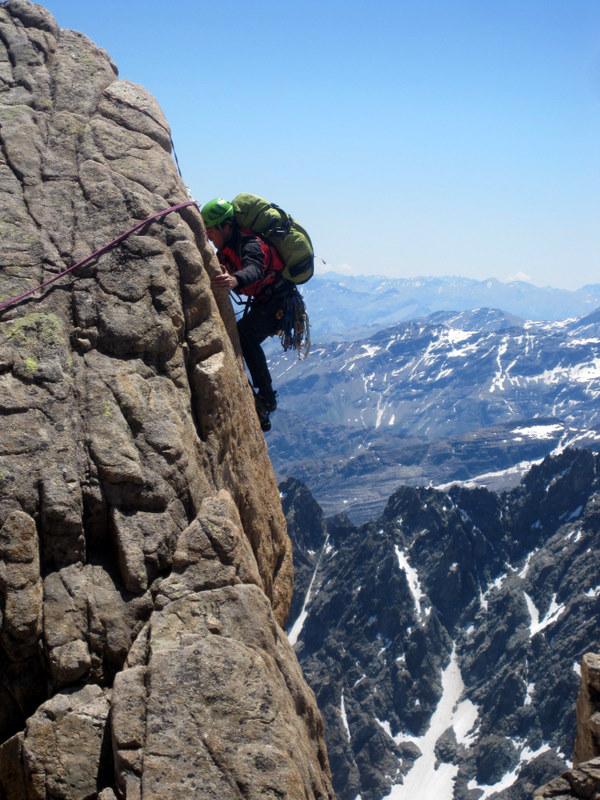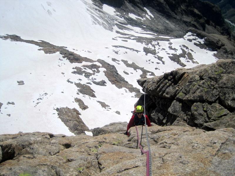 Nella prima parte l’itinerario non è così facile da individuare, noi e le altre due cordate di francesi abbiamo perso parecchio tempo, impiegando alla fine quasi 5 ore dall’attacco alla cima. Più veloce ( 2 ore) la traversata dei gendarmi della cresta nord fino alla forcella, dove inizia la discesa. Le doppie sono ben attrezzate, tutte spostate sulla destra orografica del canale, abbastanza protette dalle cadute di pietre, ma non elementari.