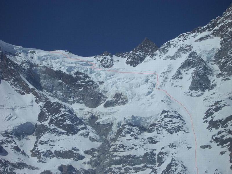 Dal rifugio scendere nel vicino canalone e risalirlo direttamente puntando alla punta Dufour, una volta alla sua base rocciosa risalire il canalino alla sua dx salendo (pass. a 55°) che porta alla Silbelsattel o Sella d’Argento quota 4515mt. tra Dufour e Nordend.