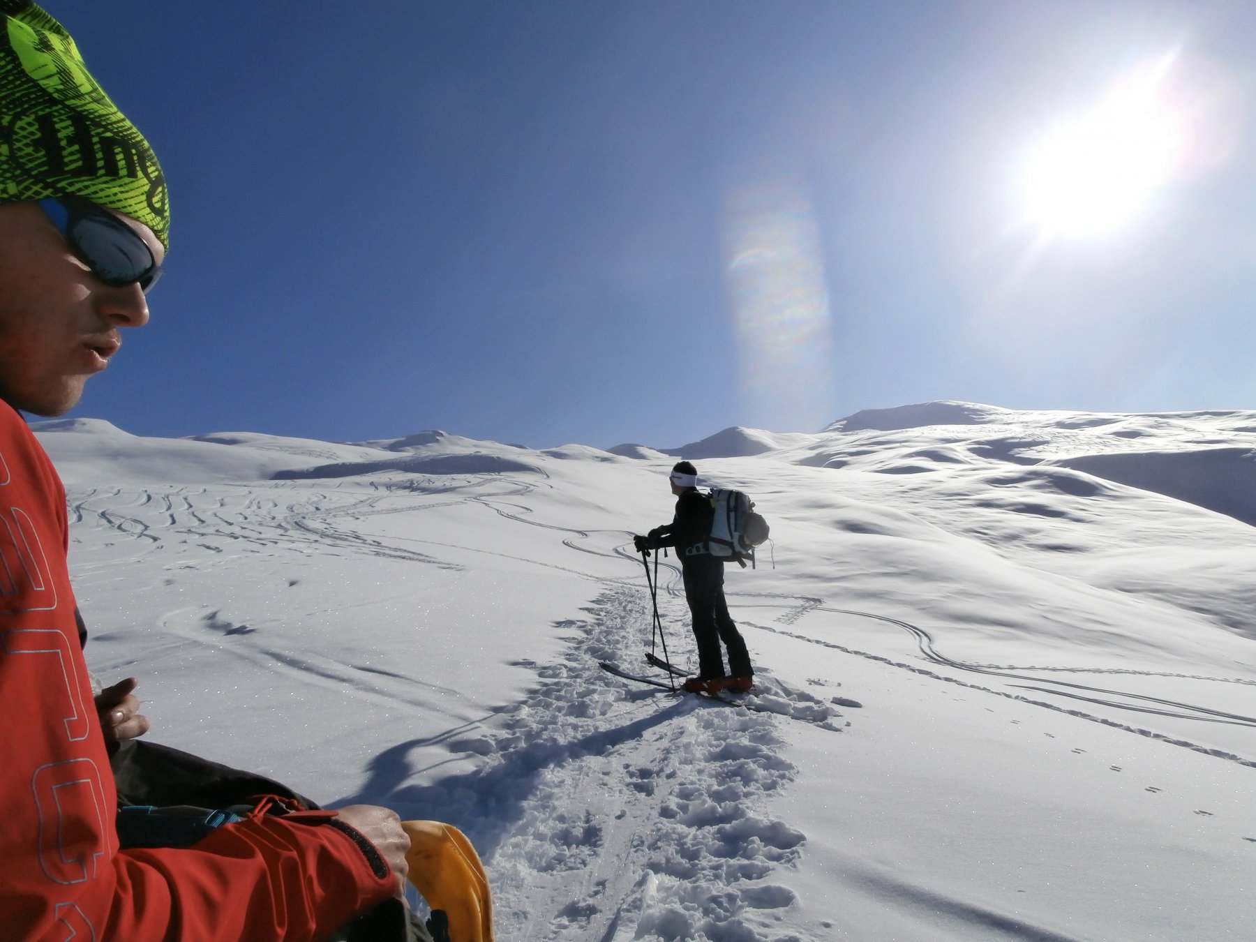 Temperature più basse rispetto a giovedì, quindi neve decisamente migliore. Prima mattinata con cielo velato e lunga strada strabattuta, migliora appena la si lascia su una super traccia fino alla panoramica cima. Esce anche un sole più deciso che ci permettere di godere di una lunga e quasi solitaria sosta; divertente anche la discesa fino al gias, poi la noiosa stradina fino all’auto. Oggi con Teo (skialp) Lorenzo e Maycol: bella compagnia.