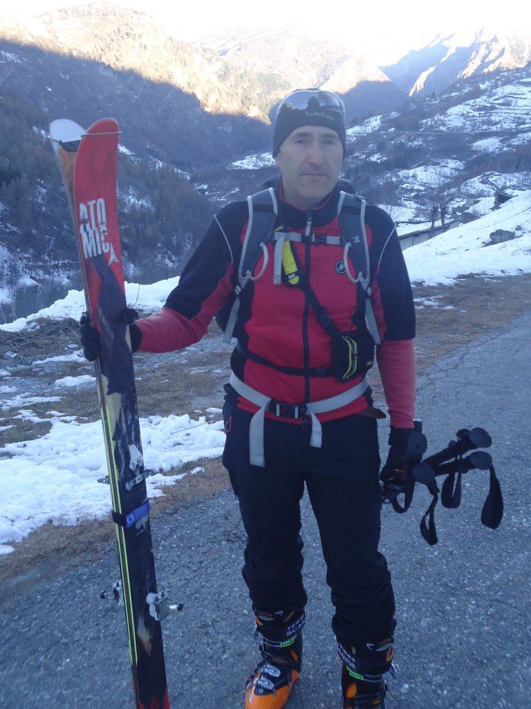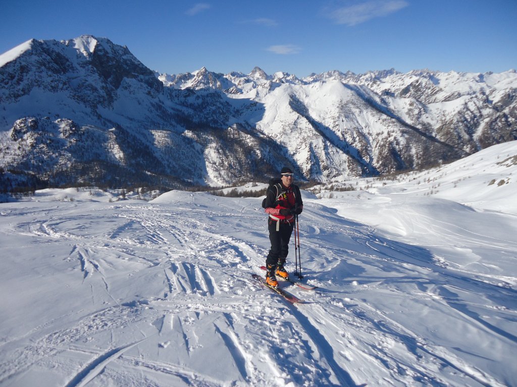 Si parte nei pressi della fontana poco oltre il bivio della Frazione Tolosano. Poca neve sulla strada ma sufficiente per partire, peccato alle vistose ruere lasciate da auto o fuoristrada. Trovata una oggi poco più avanti (chissà cosa avrà mai risparmiato…) Innevamento buono dalle Grange Lauset in sù. Seguito ottima traccia sino in vetta. Proseguito sulla cresta di dorsale per poter sfruttare gli ampi pendii intonsi e immacolati della Valle Grana lato Valcavera, dove abbiamo trovato ancora qualche traccia di farina compressa divertente. Scesi per circa 200 mt. e poi risaliti in cima battendo traccia. Scesi trovando ancora ampi spazi vergini su bella neve divertente (anche qua un pò di farina compressa) sino a poco prima delle Grange, dove l’ombra aveva già reso la neve crostosa a volte non portante. Rientro alla macchina su stradina spaccagambe. Alle prossime