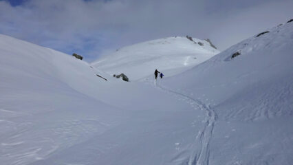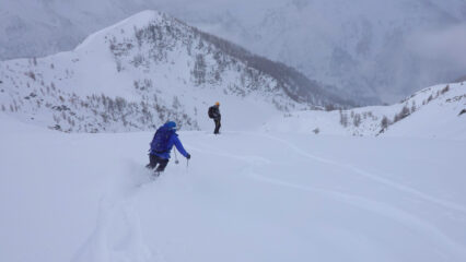 Giornata con tempo variabile in peggioramento . In vece del Sibolet siamo saliti sulla dorsale in direzione della P. Tempesta e ci siamo fermati a quota 2560 per peggioramento del tempo . In 3 siamo scesi nella comba dell’ Oliveto con diagonale verso Tempesta . Percorso quasi intonso con neve farinosa , leggermente pesante ma godibilissima sino oltre il Gias dell ‘ Oliveto . Raggiunta la strada ci siamo riuniti .