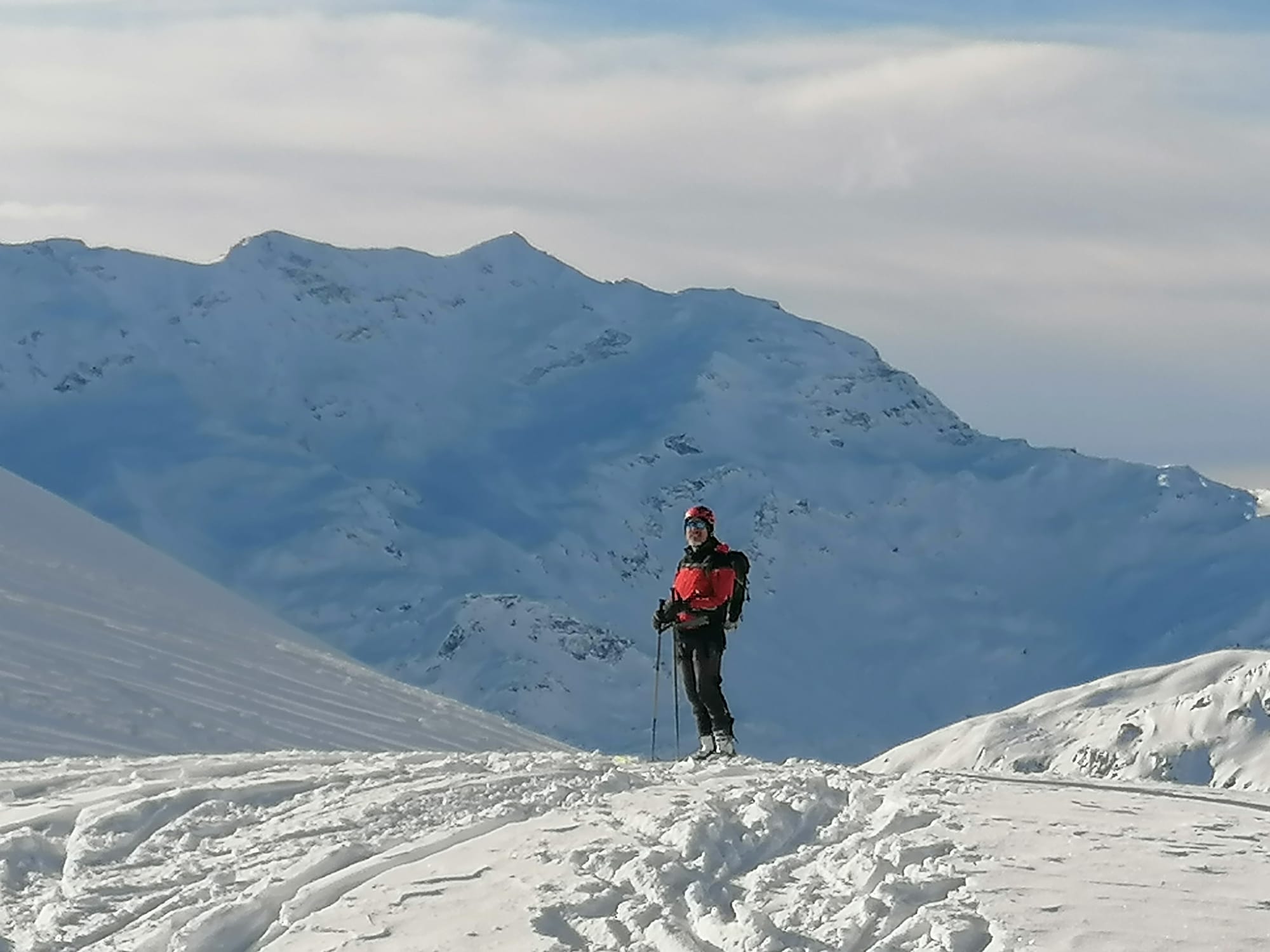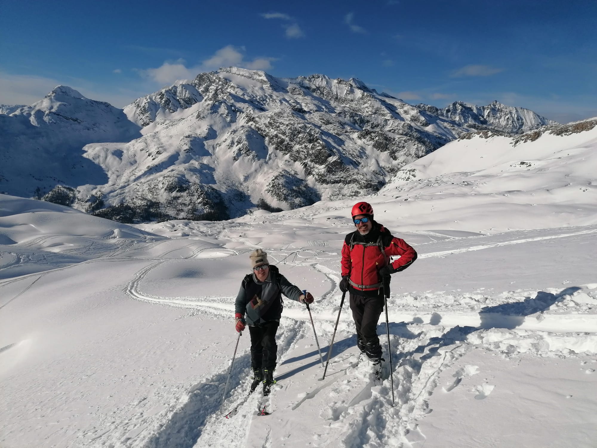 Discesa. I pendii centrali sono ormai iper-tritati (motivo della quinta stella mancata). Però i piani superiori sono molto ampi e zone intonse o quasi si trovano ancora. La neve è polvere perfetta sul 95% della superficie. Qualche pendio un po’ ventato c’è, ma bisogna proprio andarselo a cercare. Dove inizia il bosco il percorso è meno libero, per trovare zone intonse bisogna passare nel bosco e qui si sente un po’ l’esiguità del fondo. Ma si arriva presto alla stradina di rientro, perfettamente innevata.