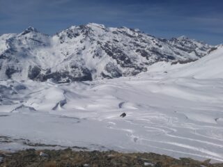 Il vento deve aver lavorato tantissimo nei giorni scorsi. Il manto nevoso è costituito da una base portante e morbida (penso spesse placche da vento), sulla quale poggiano una ventina di cm di neve fresca compatta, bella e scorrevole sul pendii meno esposti al sole, umida e non molto scorrevole sui pendii più esposti. Comunque, in generale, una sciata divertente, considerato anche che le tracce per adesso non superano la decina.