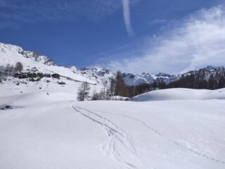 Bella gita, pensavo di trovare più gente e invece incontrato solo 5 persone. Salito dal lato destro del versante e fermato all’ultimo alpeggio. Neve parte alta farinosa su fondo portante. Ancora dello spazio intonso. Parte bassa poca e ultimo km di skating.