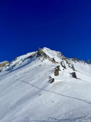 Valgrisanche innevata. 20 cm a quota 1200, 40 cm alla partenza sino a 80 nella parte alta, su fondo portante. Prima parte su strada molto comoda perché sciare nel bosco sarebbe un’azzardo. Neve sempre leggera, farinosa facile e divertente da sciare anche dove il rialzo termico ha umidificato il manto o dove il vento a lavorato. Oggi molti passaggi, ma in alto siamo scesi su pendii in larga parte intonsi. Molto tracciato e scavato l’ultimo pendio prima di imboccare la strada dove confluiscono tutti i pendii superiori. Neve all’auto