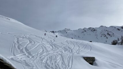 Bellissima neve polverosa in tutta la parte superiore a partire dalle baite.Nonostante molti passaggi ancora spazi intonsi. Molto tracciata ma ben sciabile nel bosco. Stradina in lieve salita al ritorno da spingere un po ‘. Con Ezio