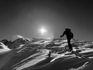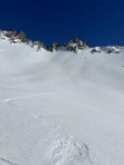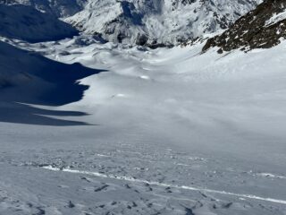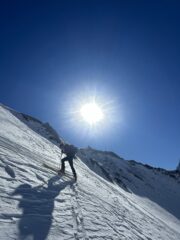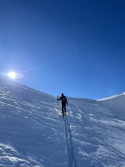 Prima parte noiosa (zona diga), neve ghiacciata e pianoro particolarmente lungo con alcune valanghe che invadono la stradina (ahimè andrà fatto anche al ritorno). Dopo la fine del bosco inizia la neve con un alternarsi di crosta portante e neve ventata. Dopo l’ultimo alpeggio tutto è diventato più interessante: paesaggio sublime, finalmente abbiamo iniziato a tracciare nella neve fresca (alcuni tratti di sastrugi o comunque ghiacciata dal vento) e così siamo arrivati prima al sigaro e poi al colletto area Laugier (3000mt ca.).