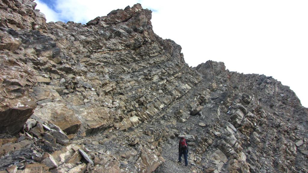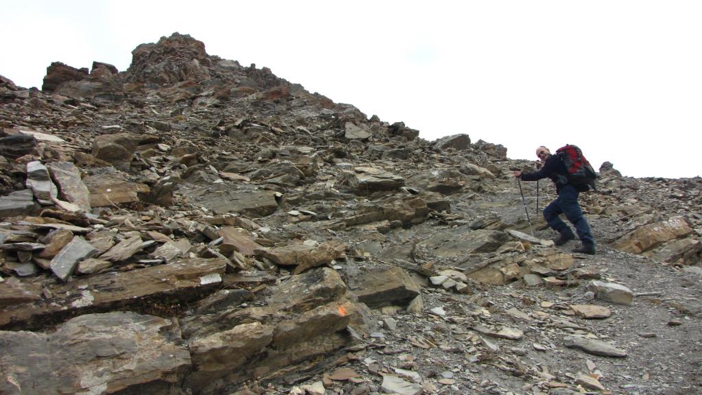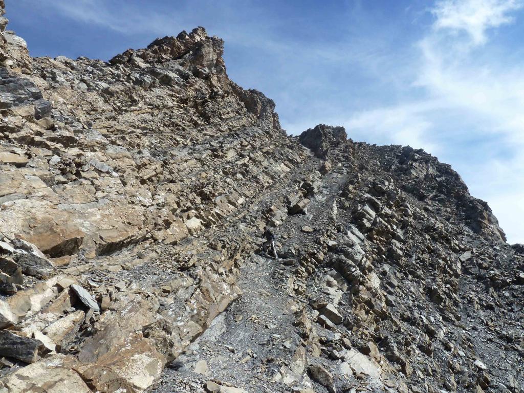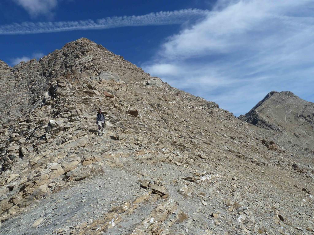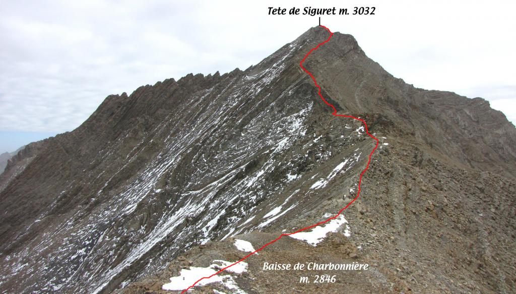 Da qui si vede tutta la parte del percorso che condurrà in cima alla Tete de Siguret, che dall’aspetto non appare così semplice, ma in realtà si salirà senza difficoltà particolari (seguendo il percorso migliore). Si prosegue sulla dorsale per un tratto pianeggiante, spostandosi poi qualche metro sotto sul versante sud, dove si noteranno i bolli rossi di vernice che andranno seguiti fino in cima, purtroppo scelta poco felice questo colore, a volte occorre aguzzare la vista.