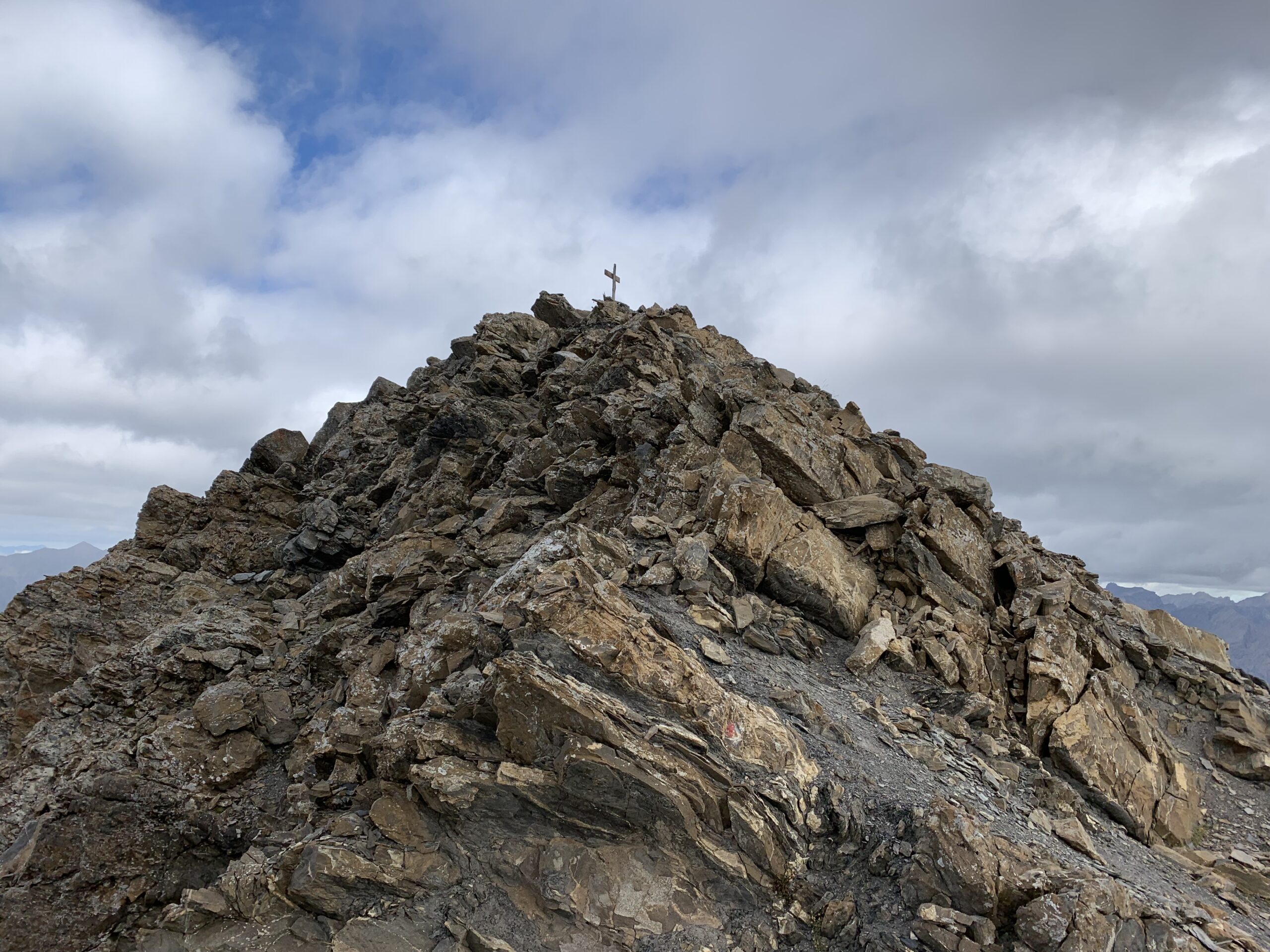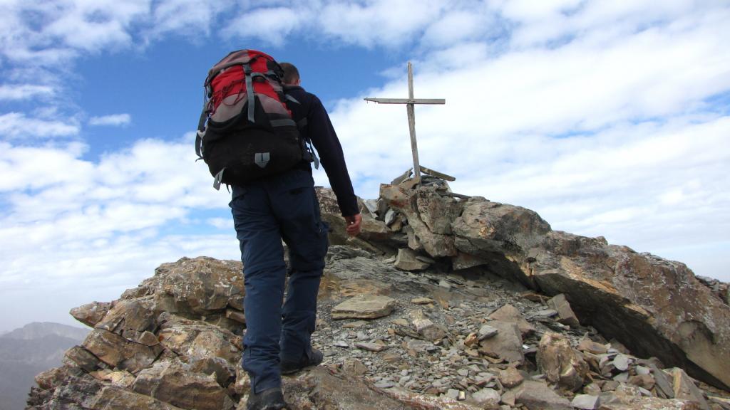 Questa cengia andrà seguita sostanzialmente fino all’intaglio a sinistra della cima, già ben visibile. Giunti al canalino sotto l’intaglio senza alcuna problematica, si incontra il secondo ed ultimo cavo metallico, che agevola la salita del canalino roccioso con fondo di terriccio un po’ scivoloso (i passi sono comunque banali di I). Dall’intaglio si volge a sinistra per traccia di sentiero raggiungendo rapidamente la vetta 3032 m, dove è presente una croce lignea con la scritta Siguret.