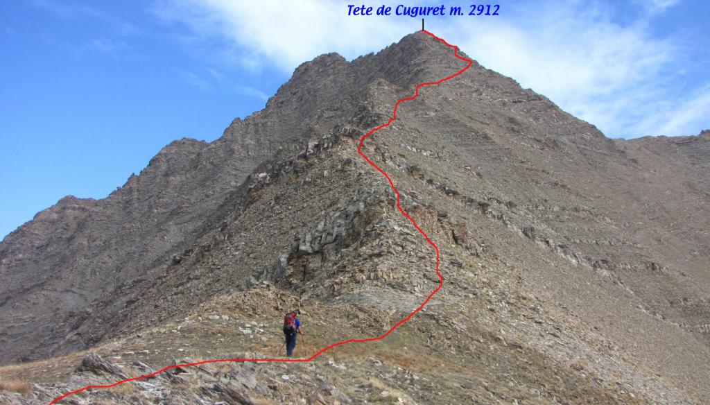 Da qui si prosegue sempre nei pressi del filo del crinale pianeggiante per arrivare alla base del pendio-crinale che sale alla Tete de Cuguret. Nonostante l’aspetto impervio, si sale piuttosto agevolmente su un buon sentiero segnalato da tacche di vernice gialla, che si snoda tra alcune brevi fasce rocciose molto semplici alternate a zone detritiche e di pietrame. a circa 30 m dalla cima s incontra la deviazione, verso destra, sulla quale proseguiremo per la Tete de Siguret; invece per salire alla sommità della Tete de Cuguret, si sale sempre il pendio seguendo i segnavia e senza difficoltà si tocca la cima 2912 m (presente una palina indicatrice).