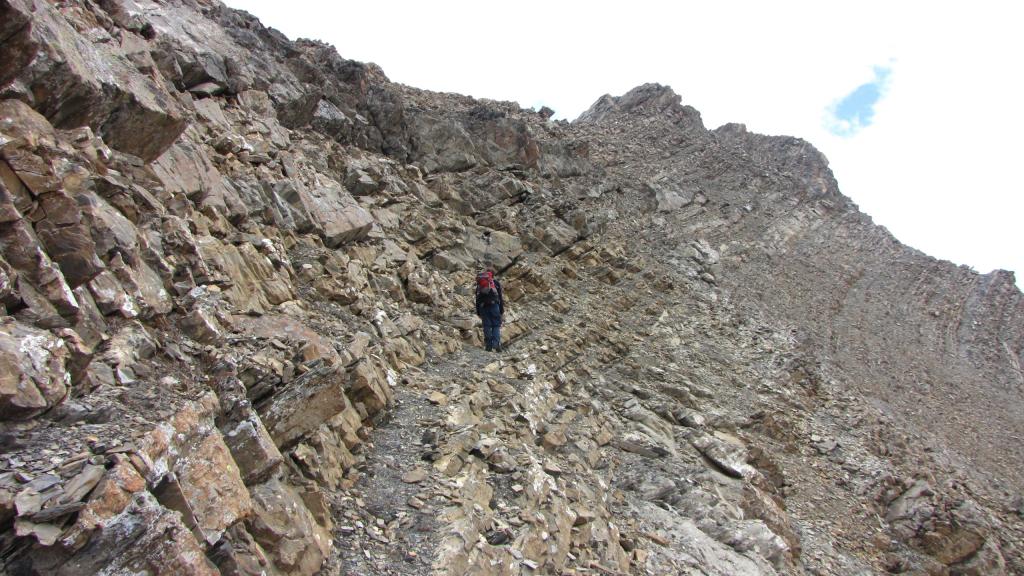 Si incontrano due canalini sul versante sud, che vanno saliti metà il primo, poi si scavalla sul secondo e lo si risale per portarsi nei pressi della cresta, alla base di un grosso diedro roccioso. Qui si incontra, sul versante nord, un breve tratto di cavo metallico che permette di aggirare il diedro su un terrazzino un po’ esposto ma molto breve; quindi ritornati in cresta si ridiscende per qualche metro sul versante sud, che non si abbandonerà più. Superate alcune banali roccette in leggera discesa si prosegue su una cengetta leggermente aerea, che poi via via diventa più larga e comoda (buona traccia di sentiero).