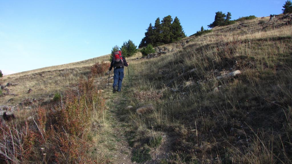 Qui si sale o direttamente sulla dorsale a monte delle costruzioni, oppure seguendo il sentiero a sinistra, che si addentra nella pineta con un diagonale verso nord, per poi ripiegare verso sud raggiungendo una dorsale erbosa, dove si ritrova l’altra traccia.