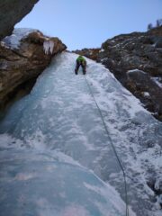 Avvicinamento pulito qualche lastra di ghiaccio sulla stradina condizioni della cascata nel complesso buone noi scesi in doppia dalla sosta tre con Dario sempre in forma