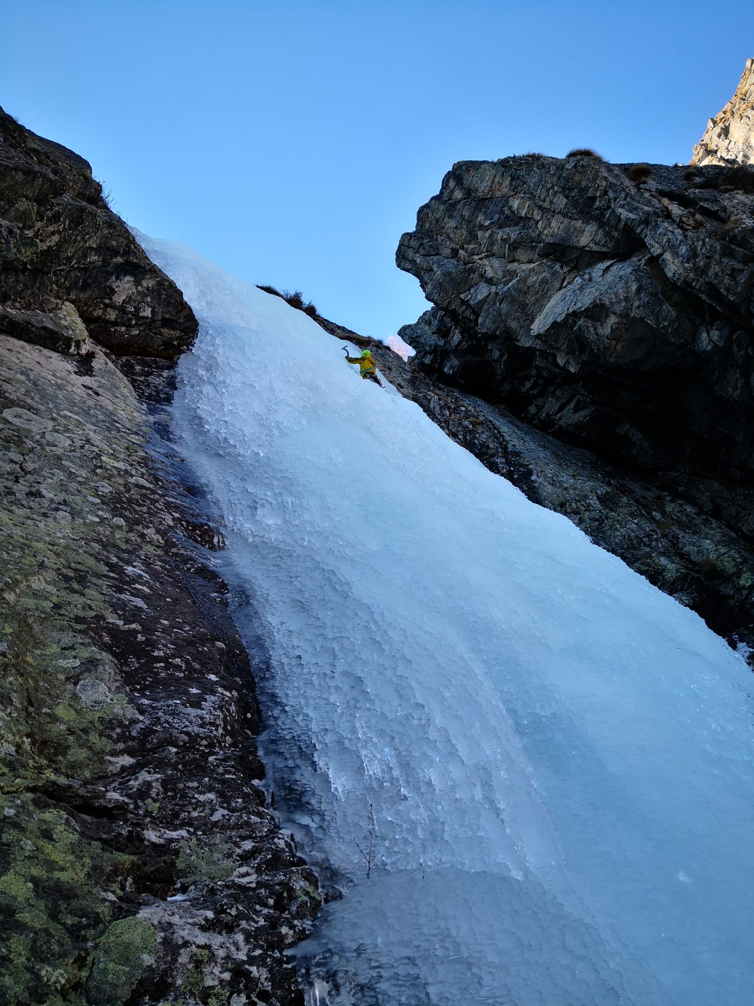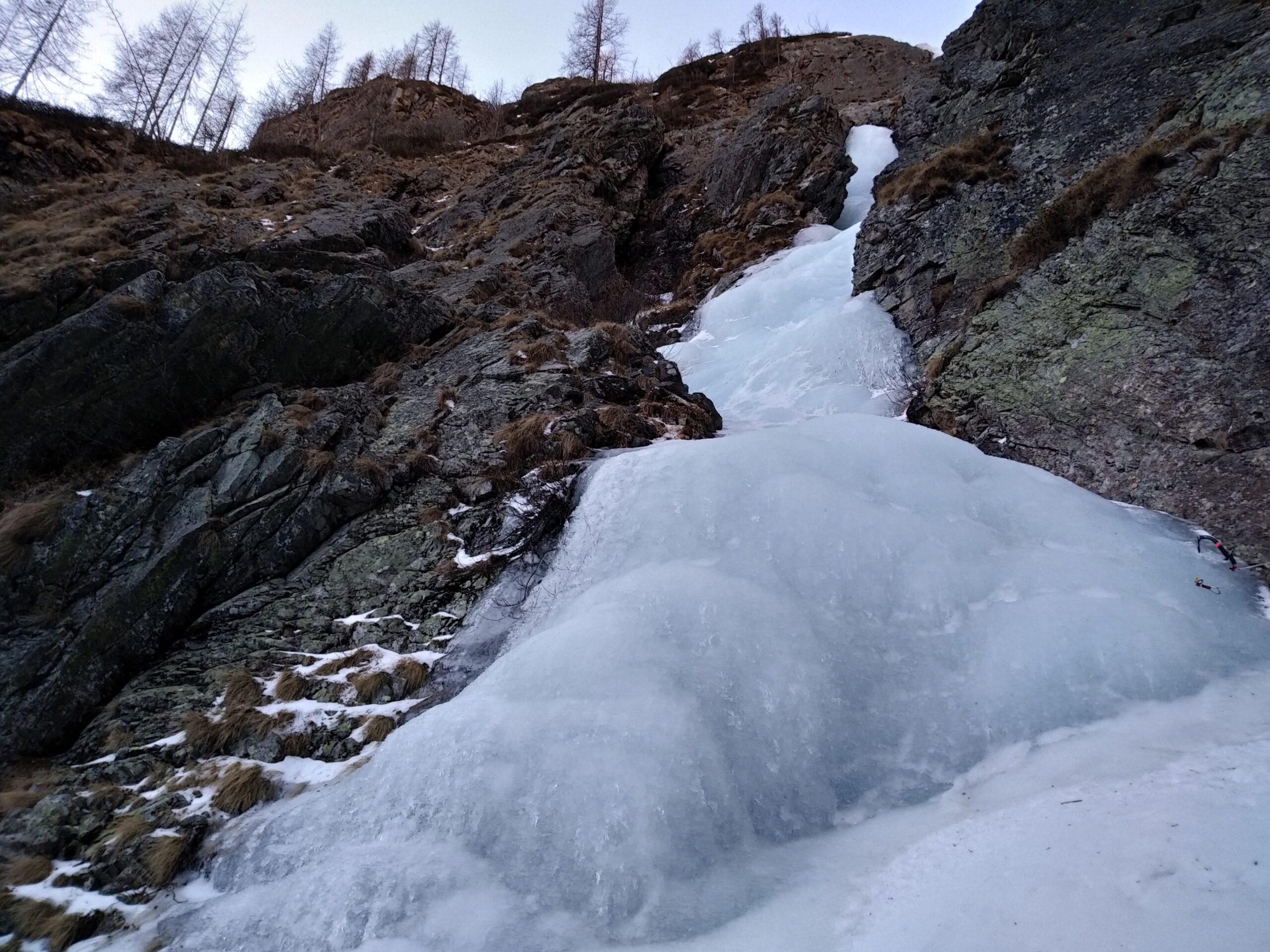 Avvicinamento senza neve,solo qualche infida placca di ghiaccio. La colata si sale in 5 lunghezze,tutte le soste attrezzate a spit tranne l’ultima. 1° tiro 40m sosta a sx, 2° tiro 50m sosta a sx, 3° tiro (tiro chiave 3+/4) 40m sosta a sx, 4° tiro 45m sosta a dx, 5° tiro 40m sosta su ontanelle a sx.