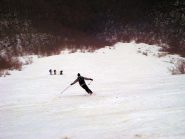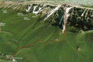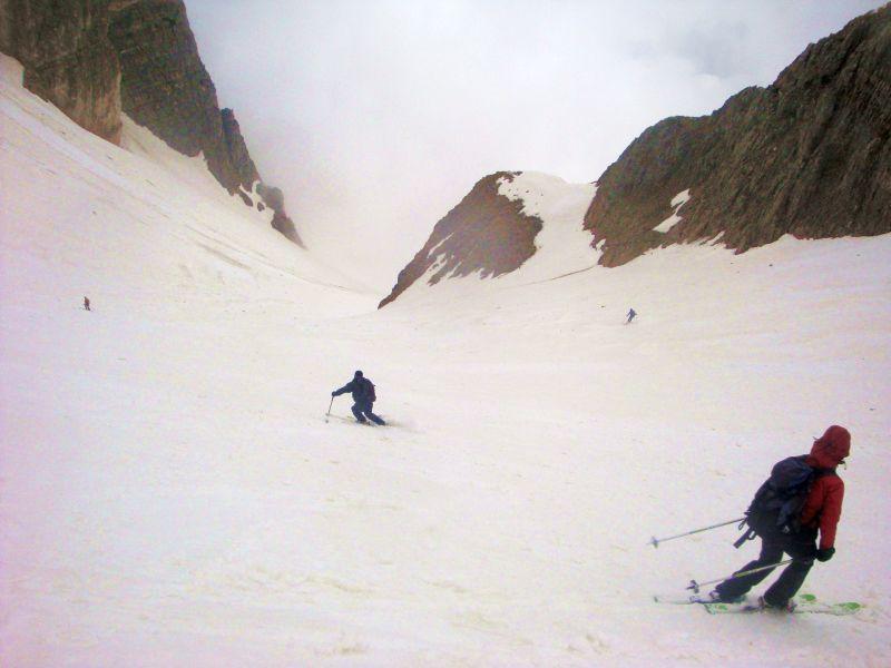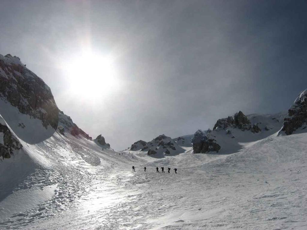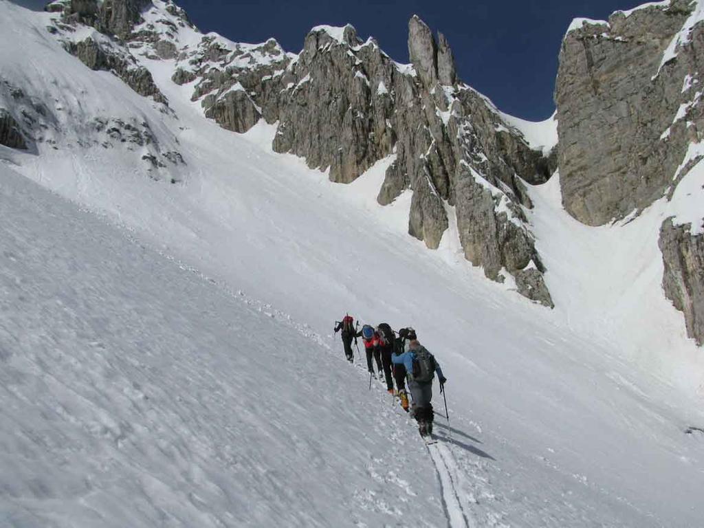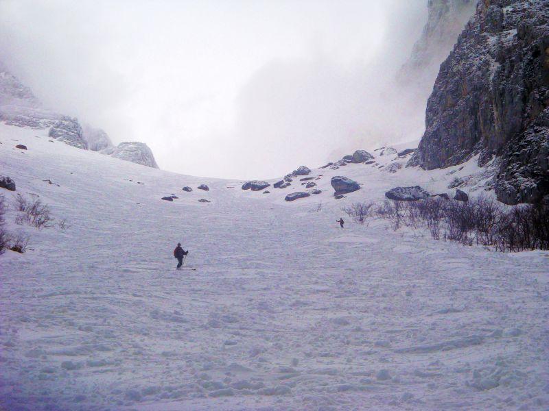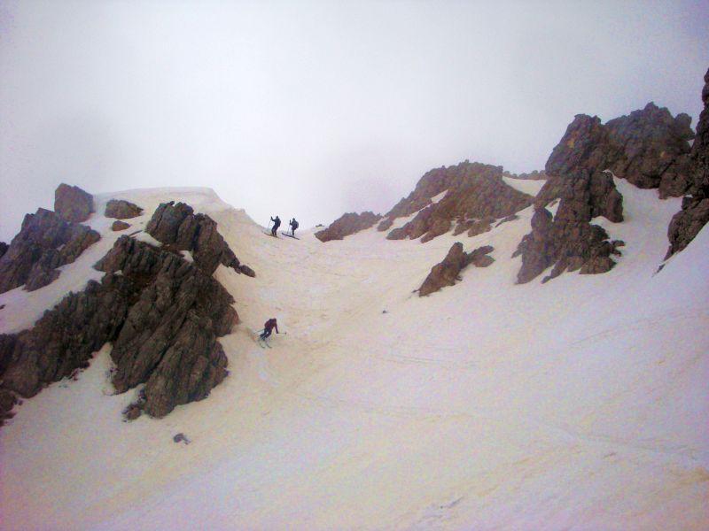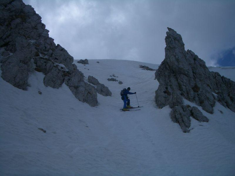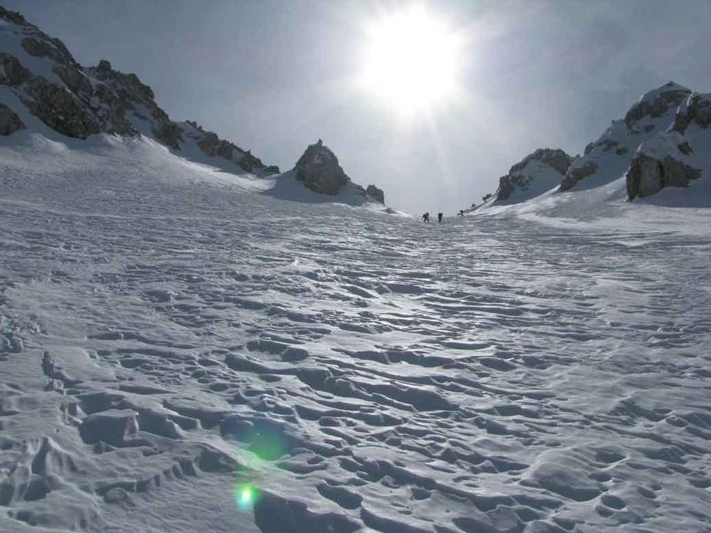 Infatti incombe su tutto l’itinerario,la minaccia di possibili valanghe e delle grosse cornici che orlano la cresta alla testata del canale.