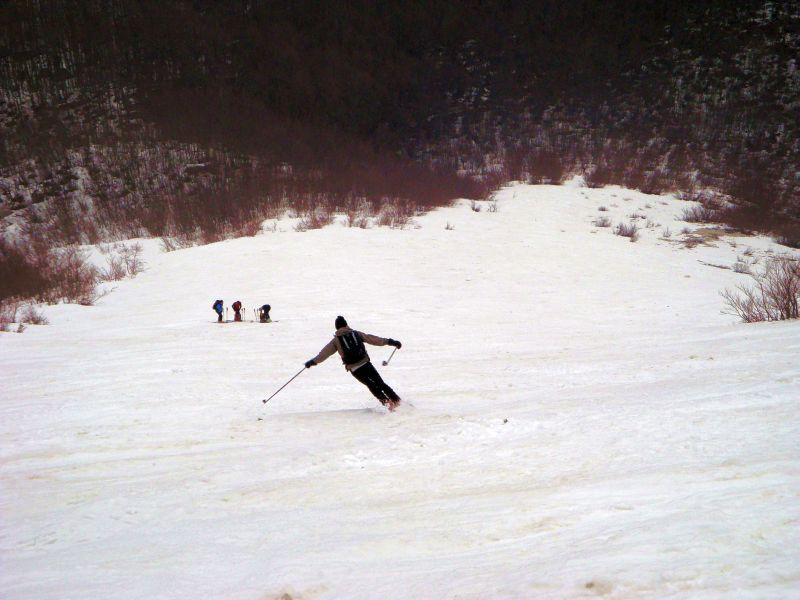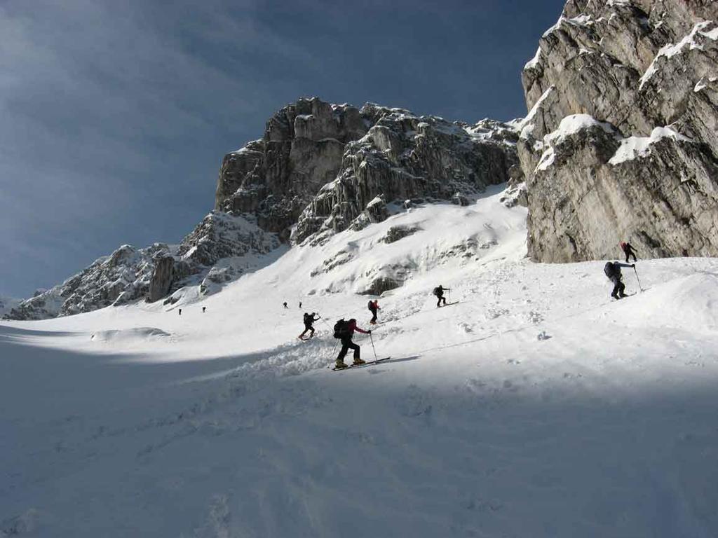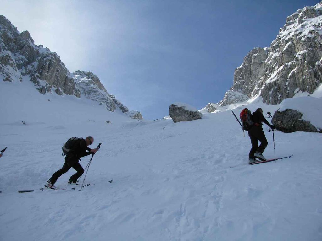 Si risale la valle su terreno aperto e mai molto ripido e se ne raggiunge la testata,guadagnando la cresta là dove le cornici spesso presenti, meglio lo consentono q. 2210.