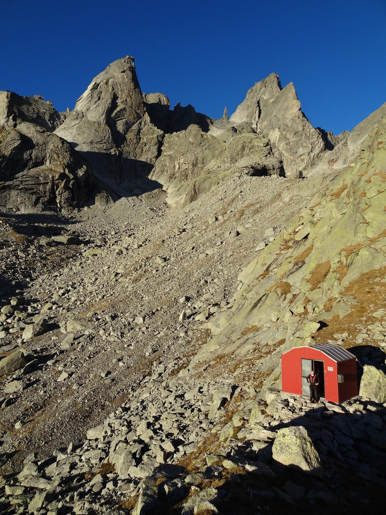 Dal bivacco salire verso nord seguendo i numerosi bolli rossi e bianchi. Le indicazioni portano al Passo del Cameraccio 2920m. Vi sono alcune catene con fittoni che aiutano nei passaggi più esposti. Raggiunto il pianeggiante colle, seguire il sentiero Roma che perdendo quota, si inoltra nell’ampio circo del Cameraccio.