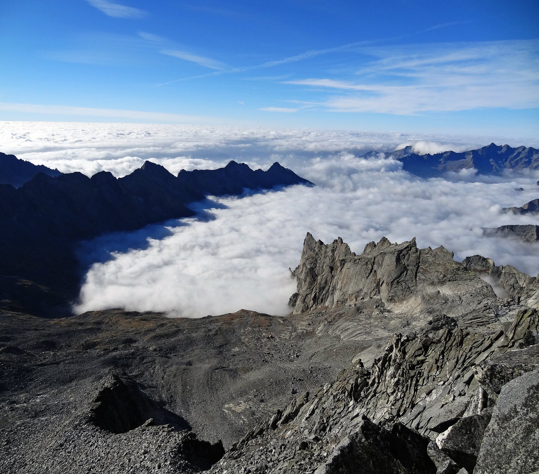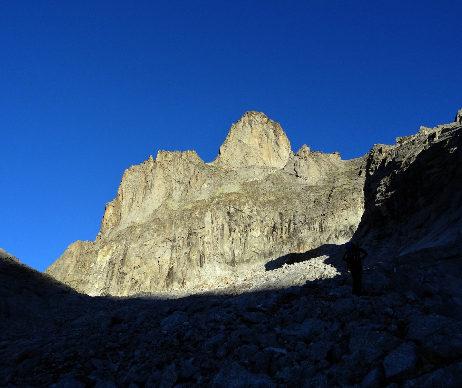 Più o meno ad una quota di 2750m, lasciare il sentiero e continuare a mezzacosta su pietraia, puntando ad un visibile ed ampio canale franoso che interrompe la parte bassa del contrafforte roccioso a sud del Monte Sissone. Questo punto è chiaramente visibile anche dal passo mentre la cima rimane nascosta fino all’ultimo.